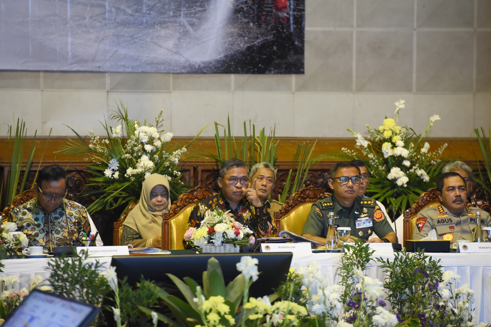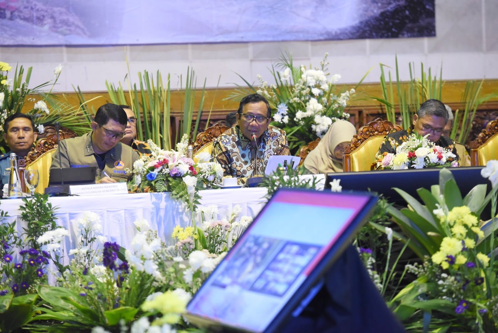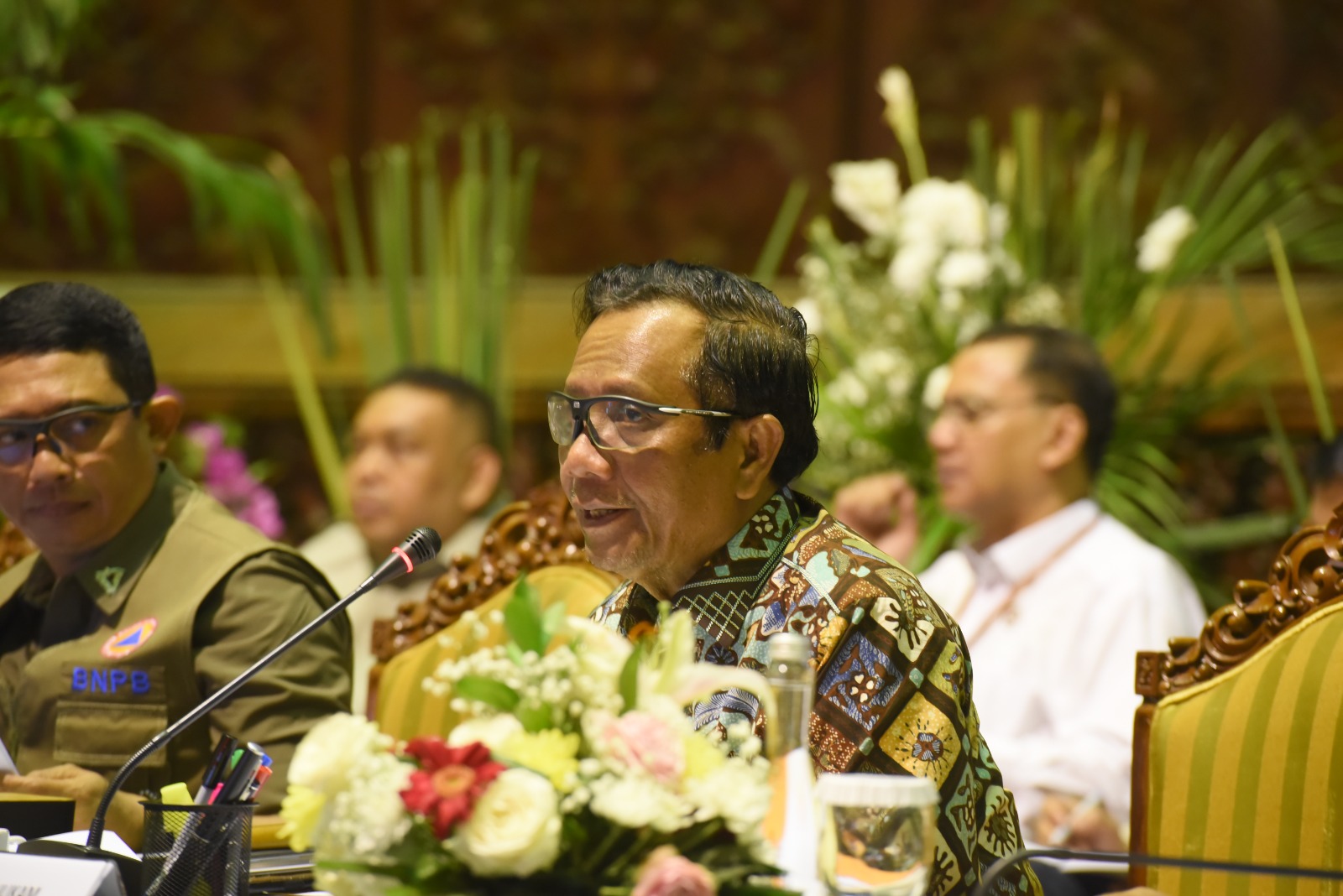 Menteri Koordinator Bidang Politik, Hukum, dan Keamanan (Menko Polhukam), Mahfud MD memimpin langsung Rapat Koordinasi Khusus (Rakorsus) Peningkatan Upaya Penanggulangan Karhutla pada Masa El Nino Tahun 2023 di Manggala Wanabakti, Jakarta, Senin (09/10/2023). Peserta rapat terdiri dari para Menteri dan Kepala Lembaga, Gubernur wilayah rawan karhutla beserta Pangdam/Danrem dan Kapolda, Kepala Kejaksaan Tinggi, para pelaksana teknis lapangan BPBD, serta para Kepala UPT Kementerian LHK.