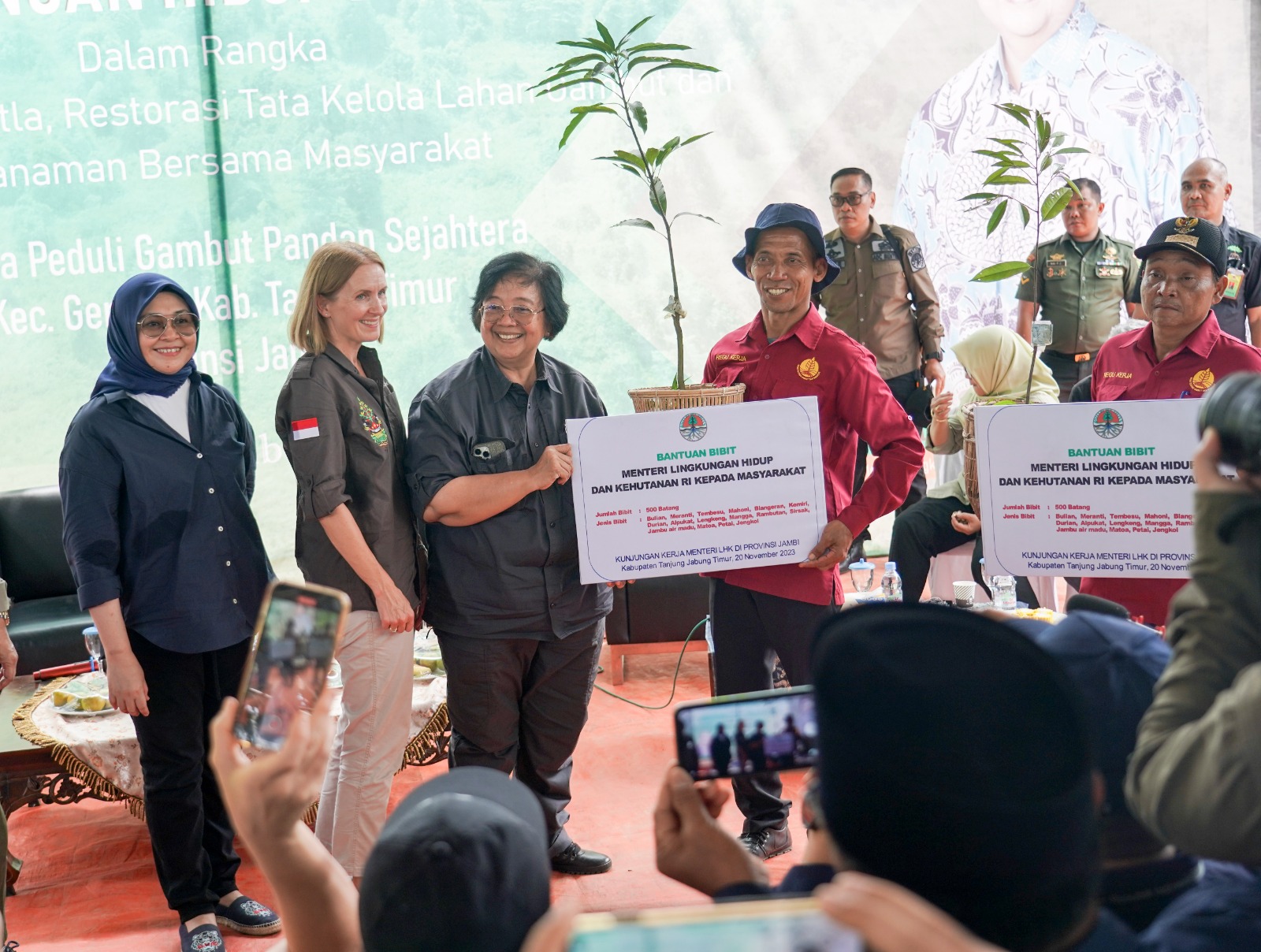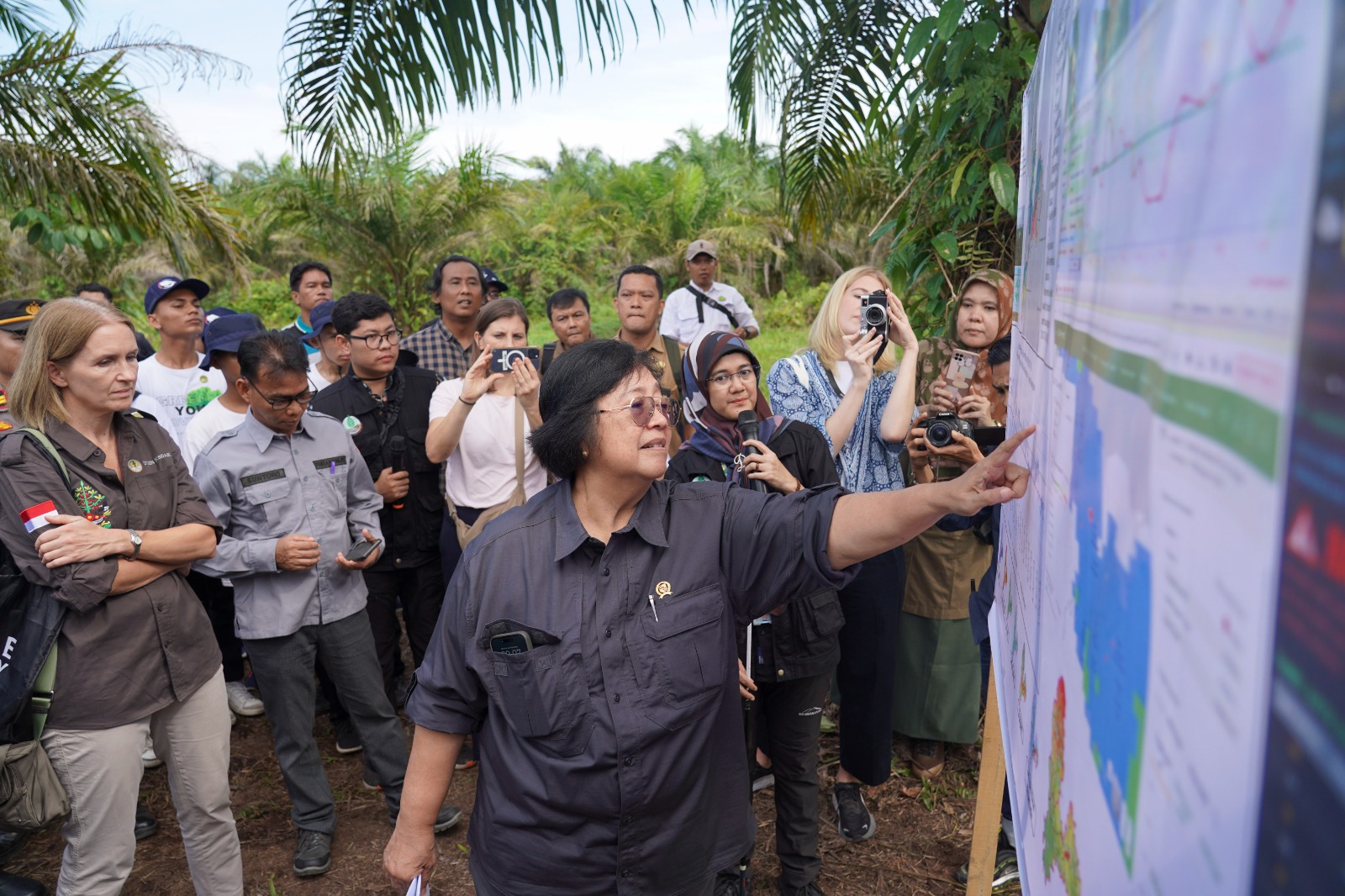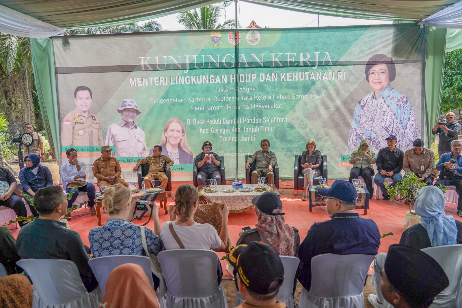 Menteri LHK Siti Nurbaya bersama Duta Besar Kerajaan Norwegia untuk Indonesia Rut Kruger Giverin melakukan kunjungan ke Provinsi Jambi pada Minggu-Senin (19-20 November 2023). Kunjungan selama dua hari ini dilakukan untuk mengapresiasi keberhasilan Pemerintah Daerah dan masyarakat Jambi dalam pengelolaan gambut, pengendalian kebakaran hutan dan lahan, serta implementasi perhutanan sosial.