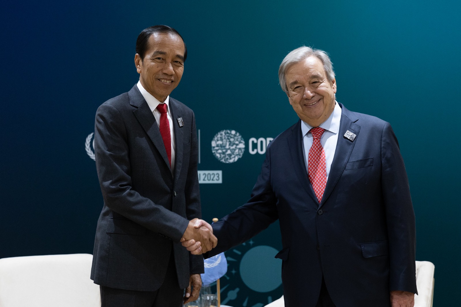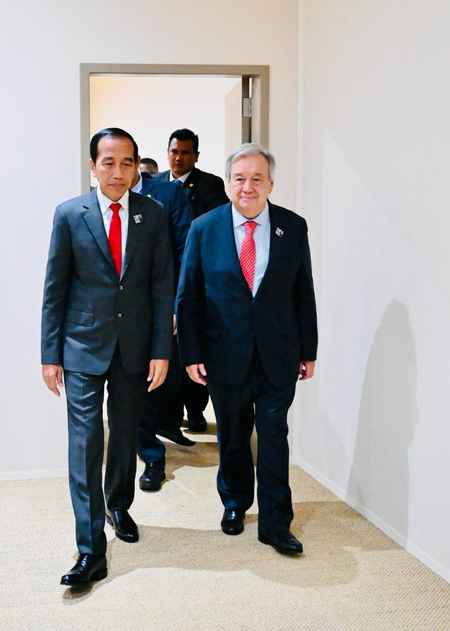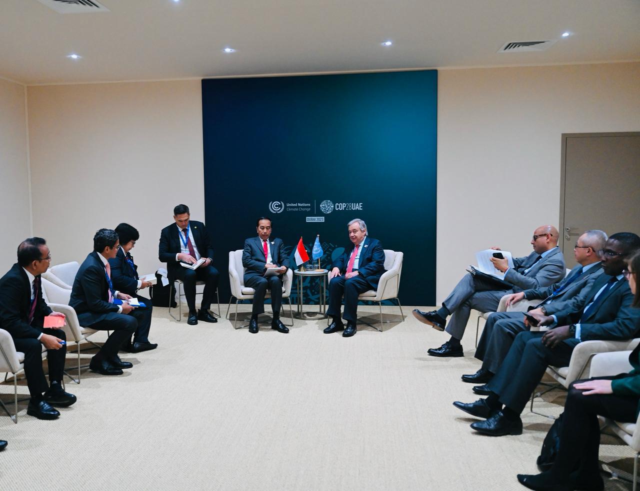 Presiden Republik Indonesia (RI) Joko Widodo didampingi oleh Menteri Sekretaris Negara Pratikno, Menteri Lingkungan Hidup dan Kehutanan Siti Nurbaya Bakar, dan Wakil Menteri Luar Negeri Pahala Mansury melakukan pertemuan bilateral dengan Sekretaris Jenderal Persatuan Bangsa-Bangsa (PBB) Antonio Guterres di Expo City Dubai, Persatuan Emirat Arab (PEA) (2/12/2023).