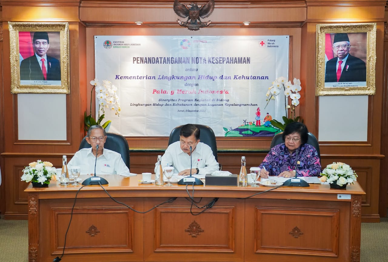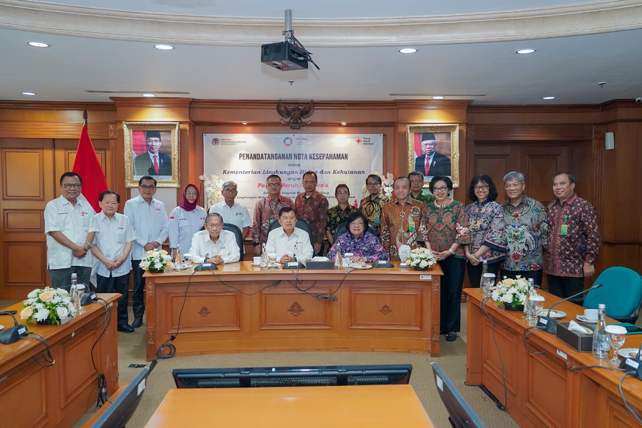Kementerian Lingkungan Hidup dan Kehutanan (KLHK) dan Palang Merah Indonesia (PMI) menjalin kerja sama dalam rangka sinergitas program dan kegiatan Bidang LHK dengan Layanan Kepalangmerahan Indonesia. Kerja sama ini tertuang dalam Nota Kesepahaman (MoU) yang ditandatangani Menteri LHK Siti Nurbaya dan Ketua Umum PMI Jusuf Kalla di Jakarta, Jumat (8/11).