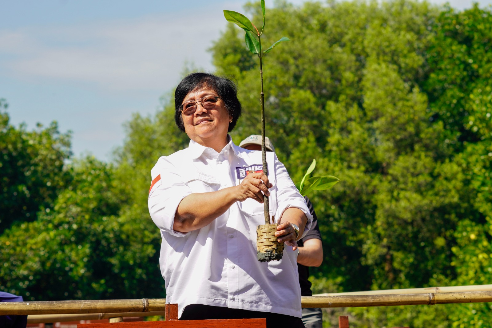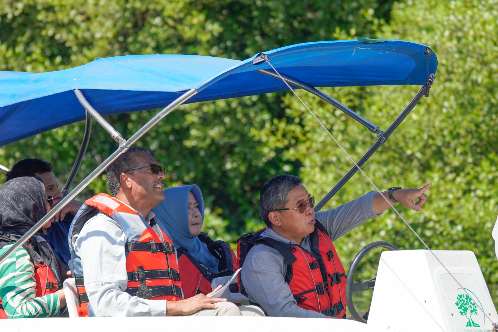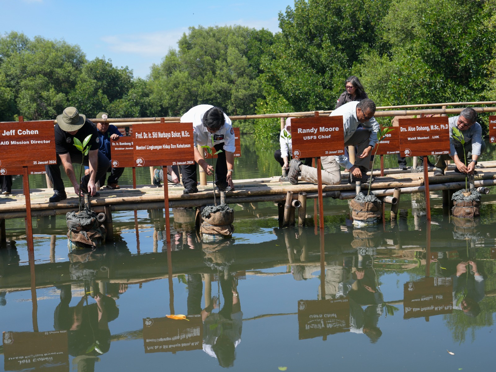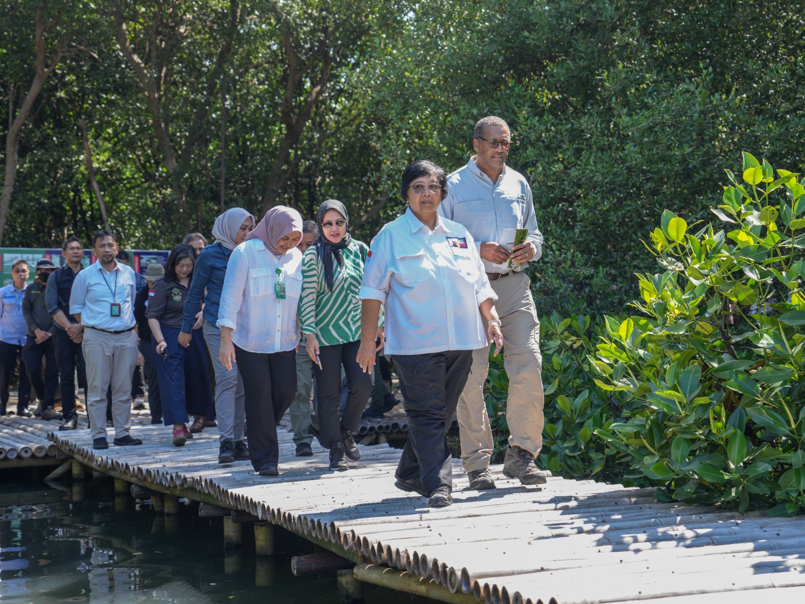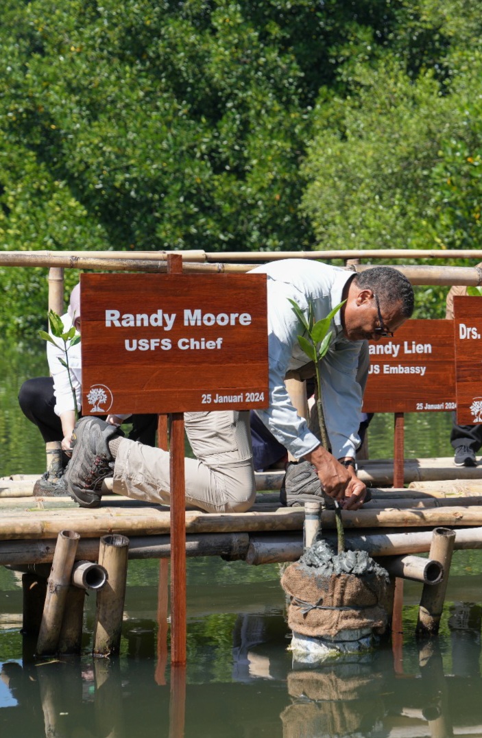 Menteri Lingkungan Hidup dan Kehutanan (LHK) Siti Nurbaya bersama dengan Chief of United States Forest Service (USFS) Randy Moore melakukan penanaman mangrove di Taman Wisata Alam (TWA) Angke Kapuk, Kamis (25/1). Dalam kegiatan ini, Delegasi USFS juga mendapat penjelasan tentang proses restorasi mangrove di kawasan ini.