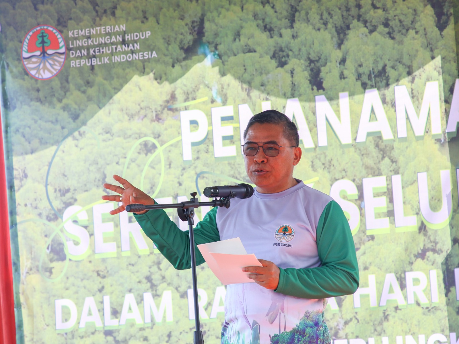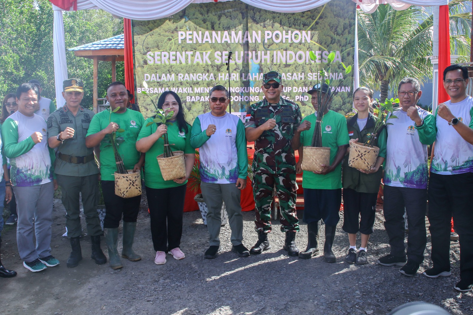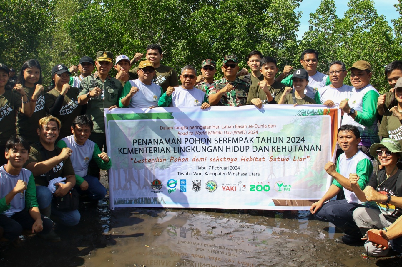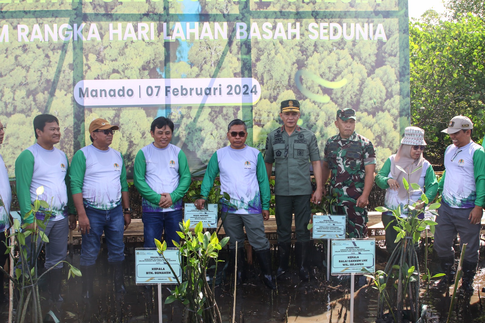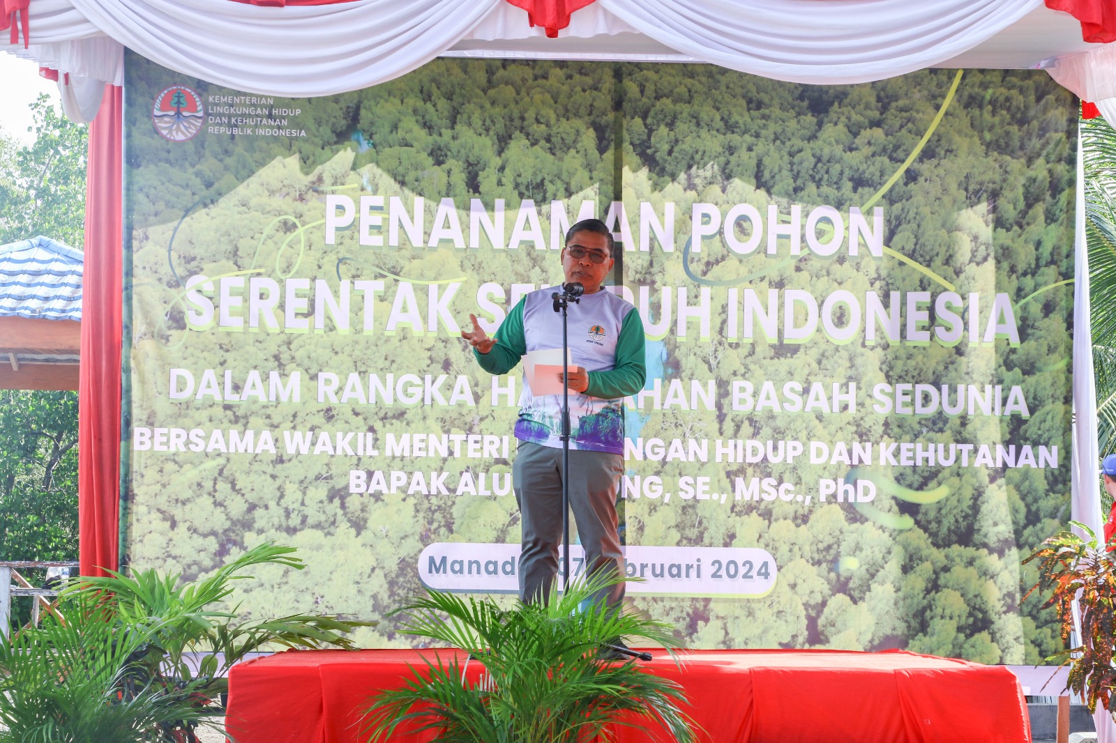 Dari Desa Tiwoho, Kab. Minahasa Utara, Wakil Menteri Lingkungan Hidup dan Kehutanan (LHK) Alue Dohong memimpin penanaman pohon serentak di tingkat Provinsi Sulawesi Utara. Wamen Alue bersama 215 orang peserta, menanam mangrove di areal yang termasuk dalam wilayah kelola Taman Nasional Bunaken tersebut.