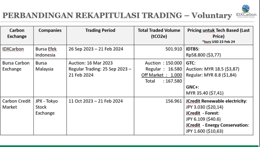 Untuk besaran volume perdagangan di bursa karbon Indonesia, dapat dilihat pada tabel terlampir.