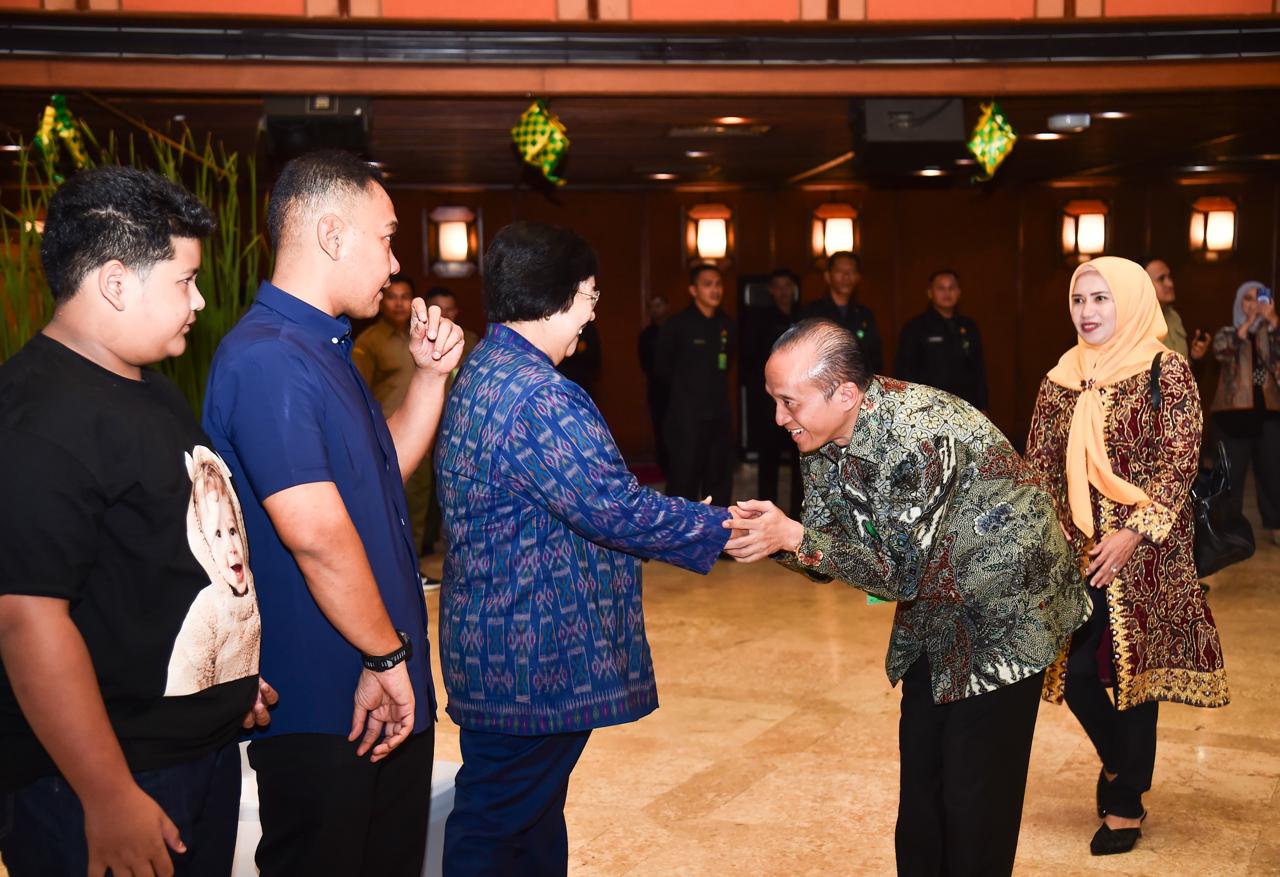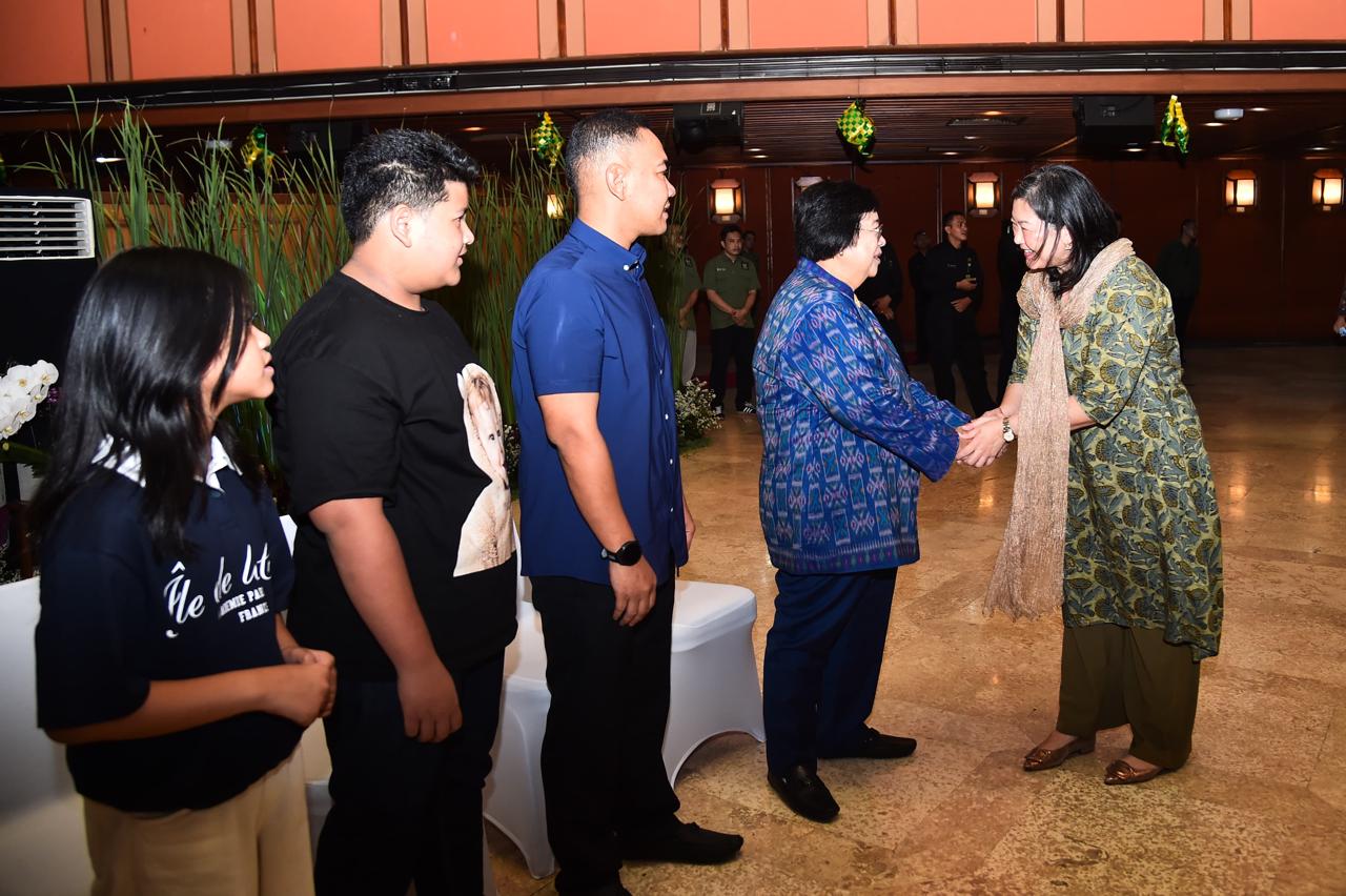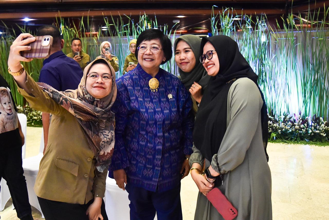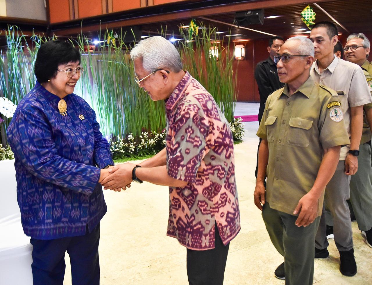 Hari pertama efektif kerja pasca libur Lebaran, Menteri Lingkungan Hidup dan Kehutanan (LHK) Siti Nurbaya menggelar halal bihalal di Auditorium Dr. Soedjarwo Gedung Manggala Wanabakti, Jakarta, pada Selasa (16/4/2024). Pada kesempatan tersebut, Menteri Siti didampingi oleh putranya yaitu Ananda Tohpati dan dua orang cucunya yaitu Shane, dan Azsyifa.