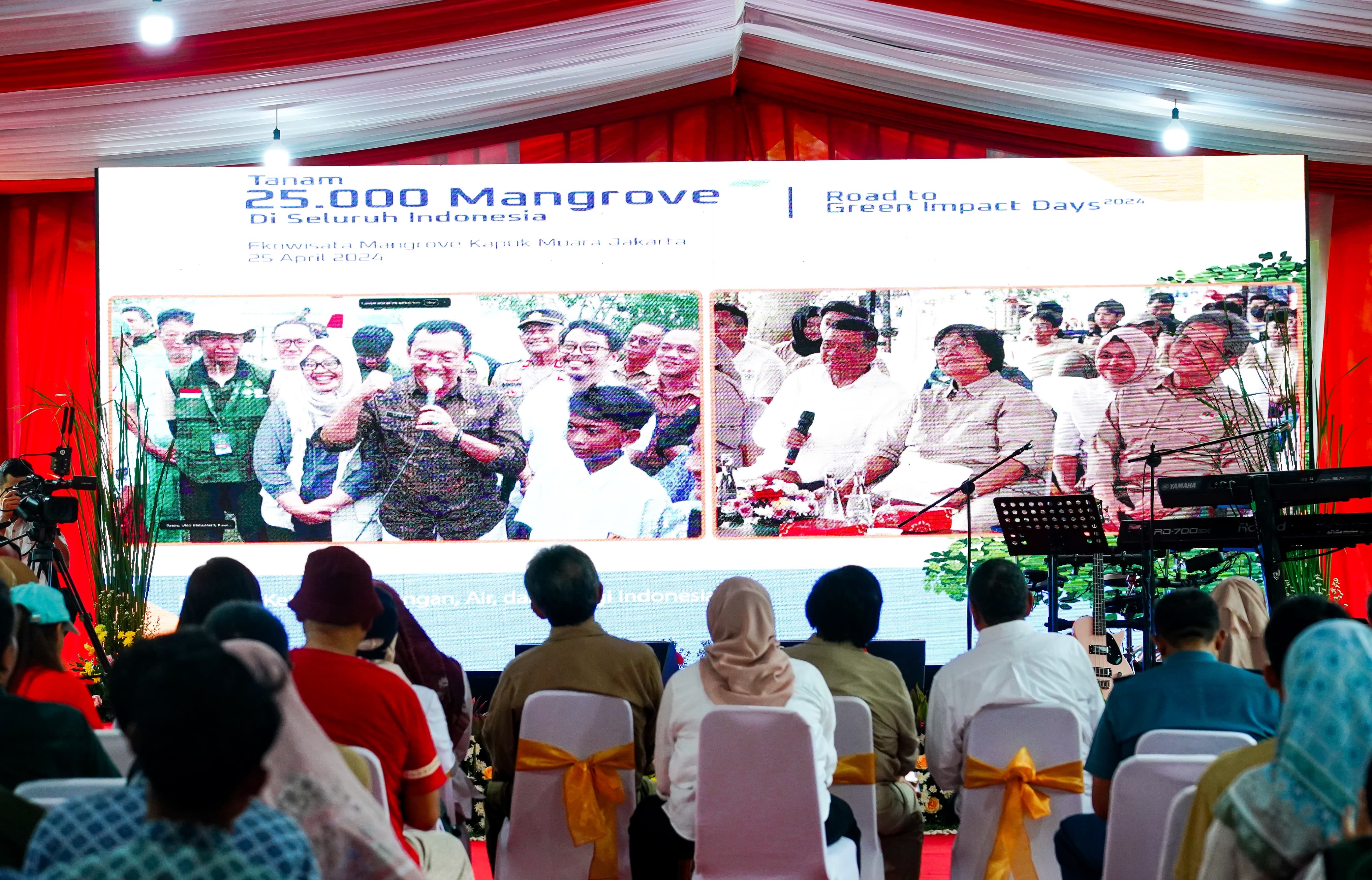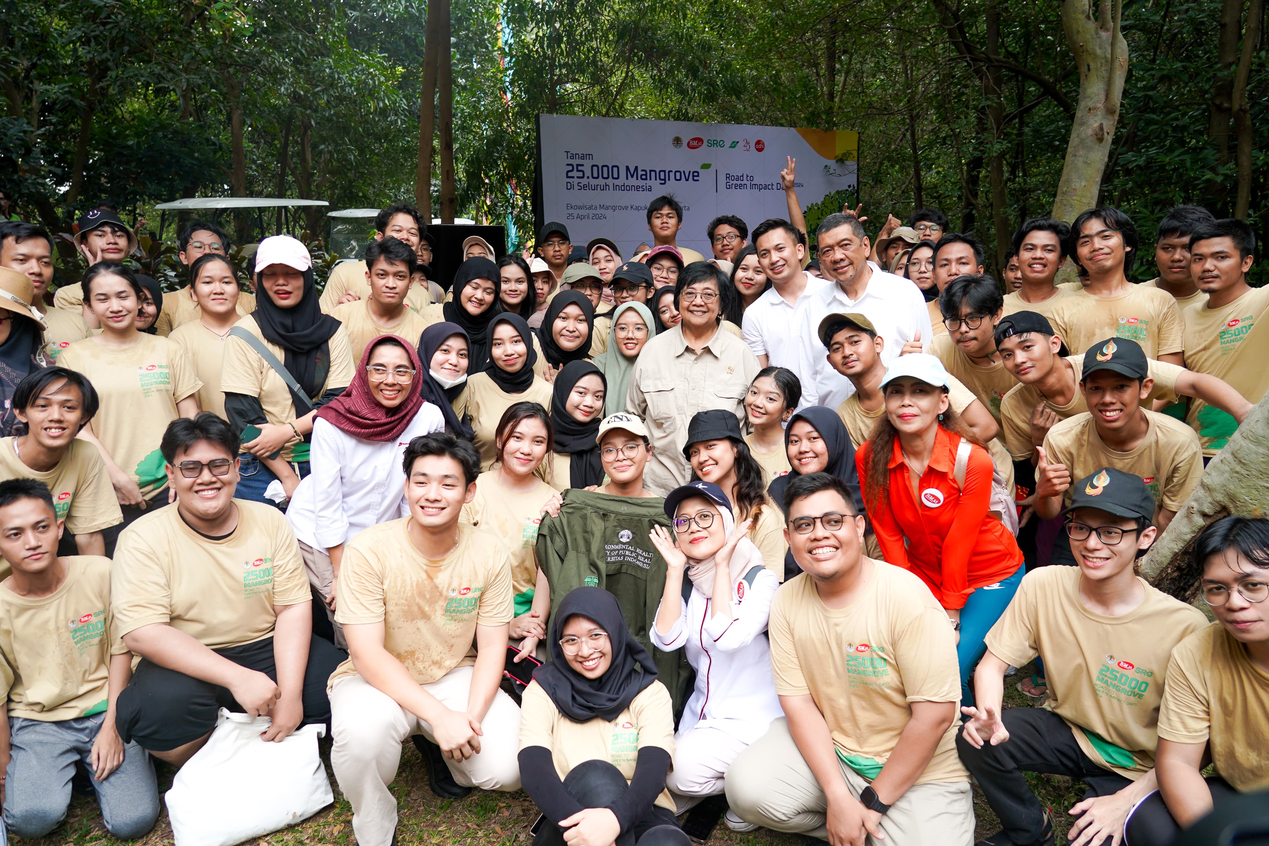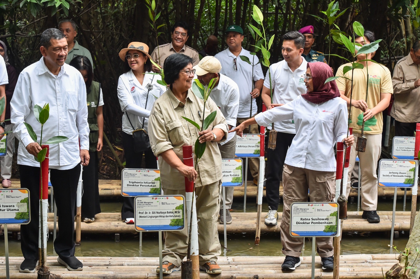 Menteri Lingkungan Hidup dan Kehutanan, Siti Nurbaya memimpin aksi Penanaman Mangrove Serentak dari Kawasan Ekowisata Mangrove Kapuk Muara, Kecamatan Penjaringan, Jakarta Utara, Kamis 25 April 2024. Penanaman Mangrove ini dilakukan serentak di 25 lokasi seluruh Indonesia.