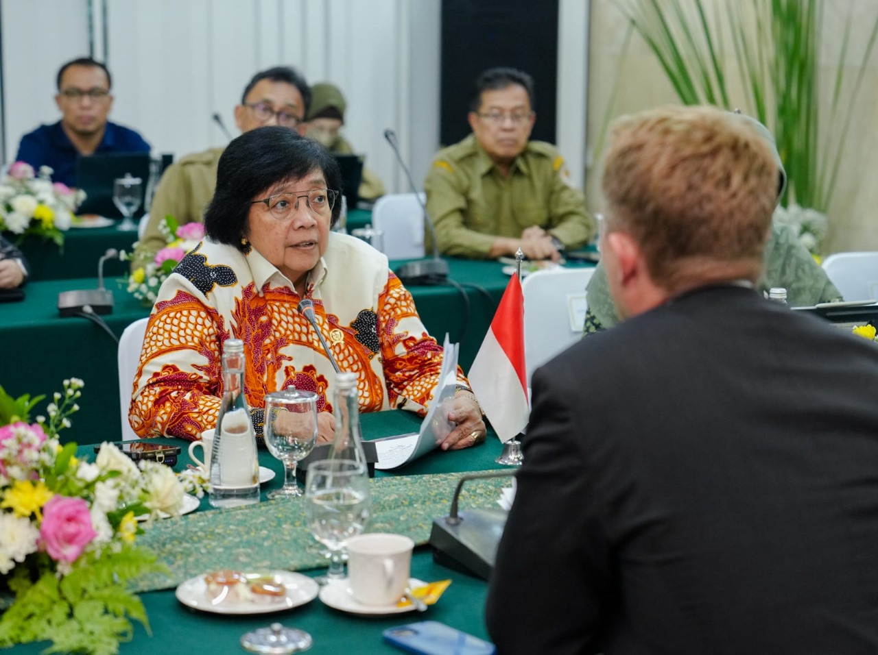 Menteri Lingkungan Hidup dan Kehutanan (LHK), Siti Nurbaya menerima kunjungan Wakil Menteri Luar Negeri (Wamenlu) Norwegia, Andreas Motzfeldt Kravik di Manggala Wanabakti, Jakarta (30 April 2024). Pada kesempatan ini, Menteri Siti menyampaikan kemajuan kerja sama antara Indonesia dan Norwegia dalam upaya mengurangi emisi gas rumah kaca (GRK) dari sektor kehutanan dan penggunaan lahan lainnya/Forestry and Other Land Use (FOLU).