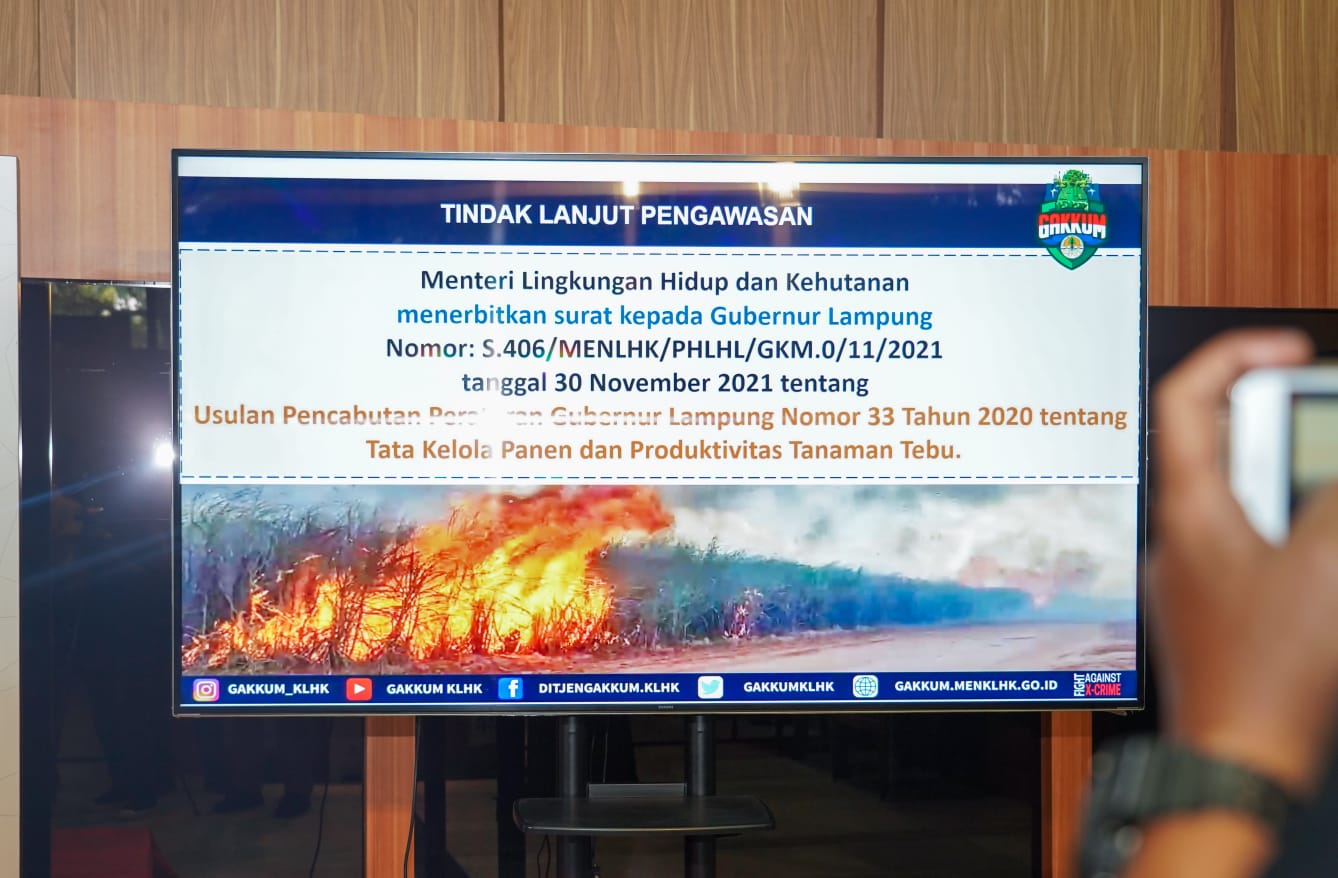 "Kebijakan Gubernur Lampung, yang memfasilitasi/mengizinkan panen tebu dengan cara membakar, harus dicabut. Kebijakan ini telah menguntungkan perusahaan secara finansial, dengan mengorbankan lingkungan hidup, masyarakat dan merugikan negara, serta bertentangan dengan Undang-undang,” tegas Direktur Jenderal Penegakan Hukum LHK, Rasio Ridho Sani dalam Konferensi Pers di Jakarta, Senin (20/05).