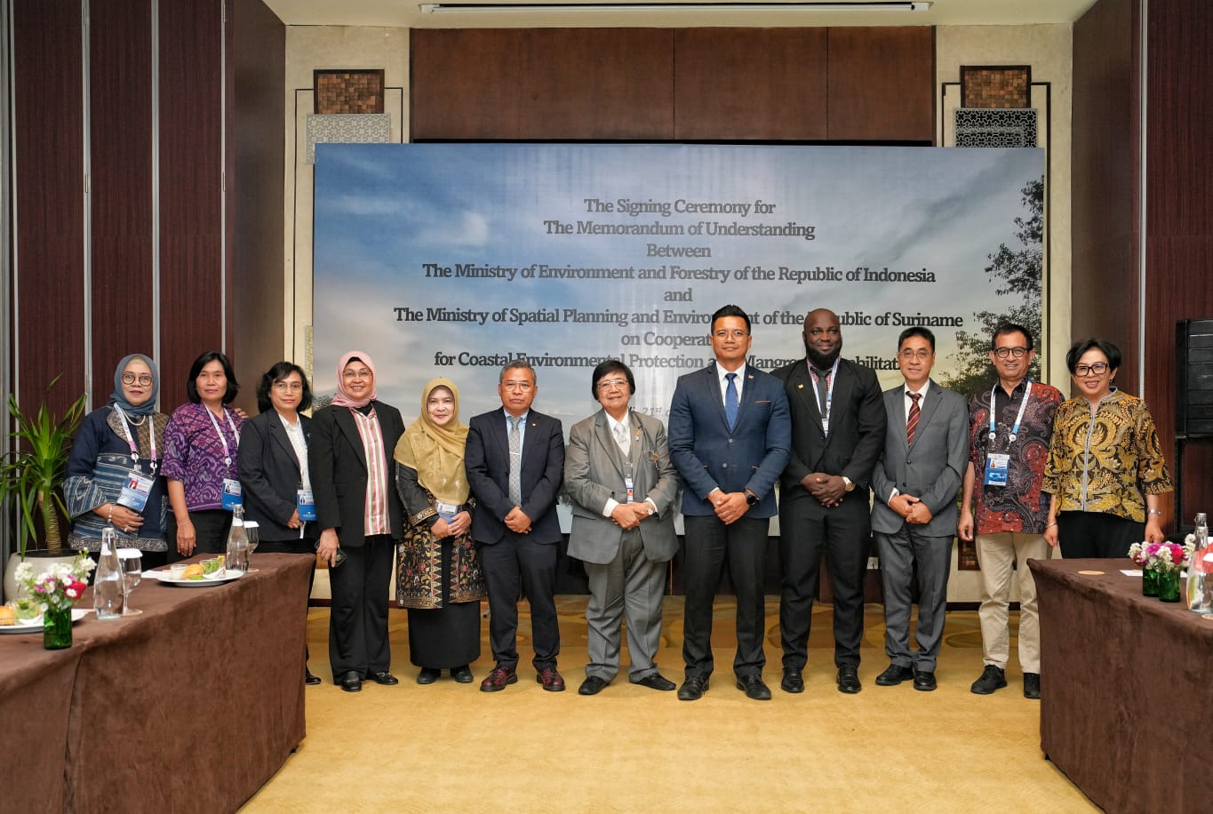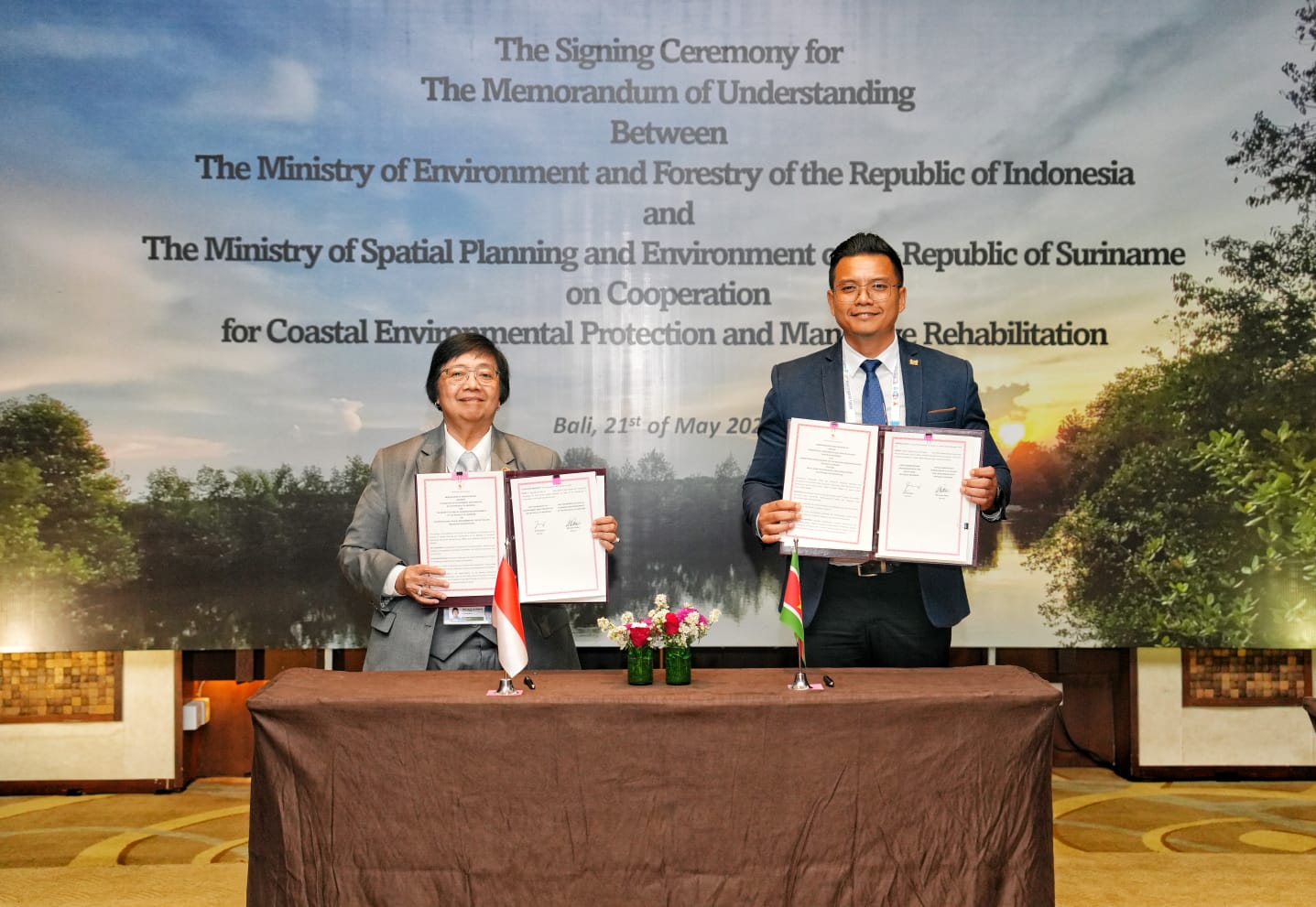 Momen gelaran World Water Forum ke-10 di Bali menjadi tonggak penting dalam hubungan bilateral antara Republik Indonesia dan Republik Suriname. Pada tanggal 25 Januari 2024, Menteri Lingkungan Hidup dan Kehutanan (LHK) Republik Indonesia, Siti Nurbaya dan Menteri Perencanaan Tata Ruang dan Lingkungan Hidup Republik Suriname, Marciano Dasai menandatangani Memorandum of Understanding (MoU) mengenai Kerja Sama dalam Perlindungan Lingkungan Pesisir dan Rehabilitasi Mangrove.