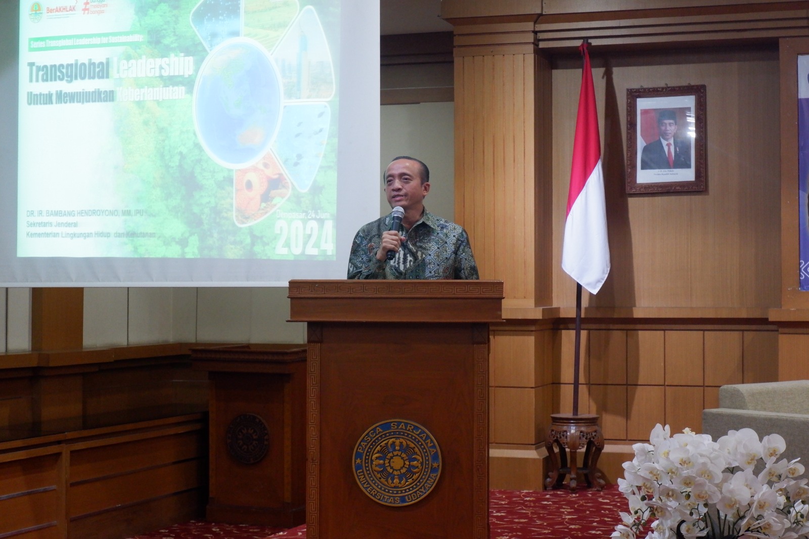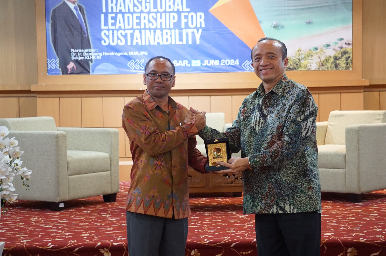 Sekretaris Jenderal Kementerian Lingkungan Hidup dan Kehutanan (KLHK), Bambang Hendroyono, memberikan kuliah umum bertajuk Transglobal Leadership untuk Mewujudkan Keberlanjutan kepada ratusan mahasiswa Universitas Udayana di Denpasar, Selasa (25/06).