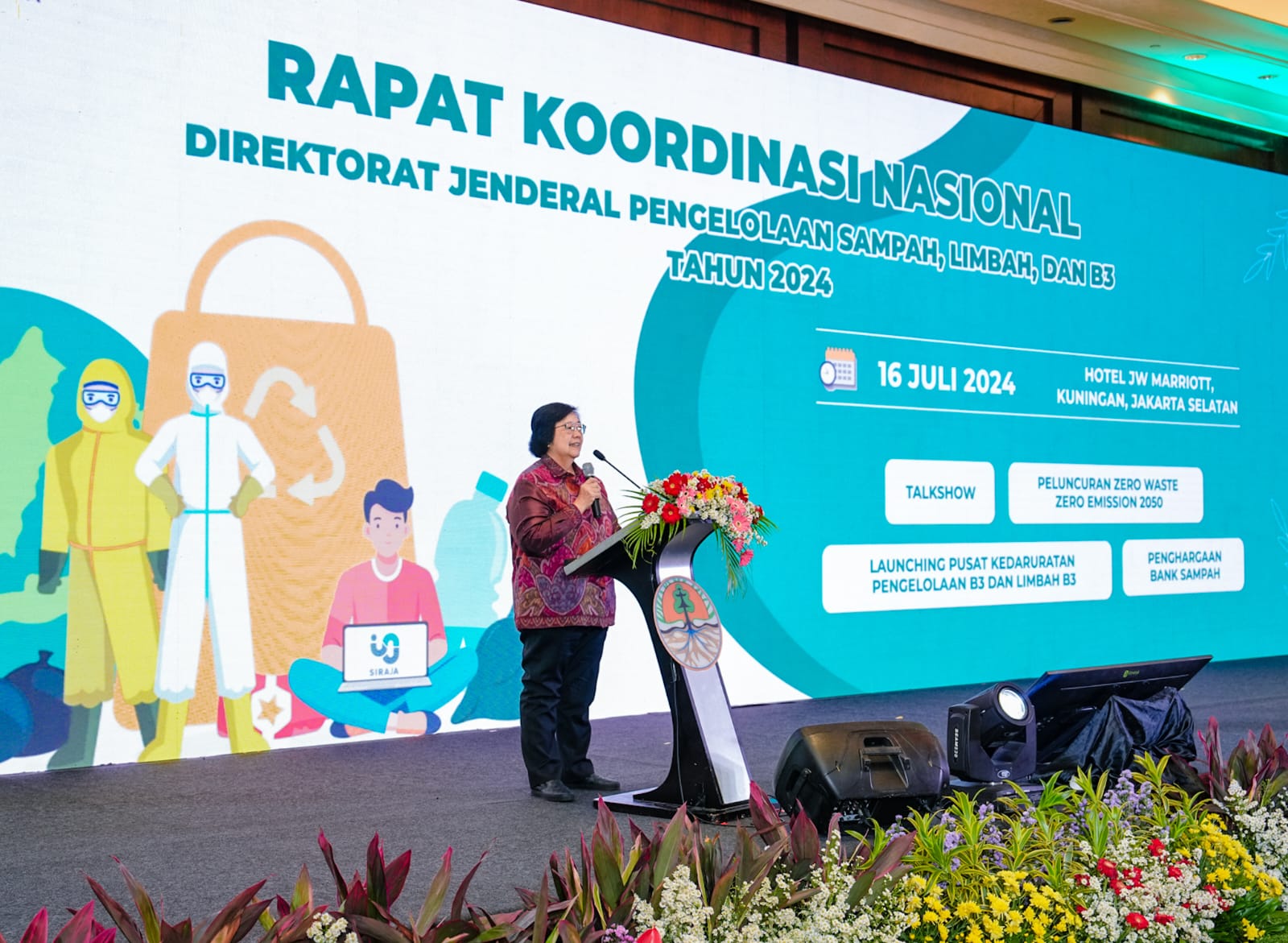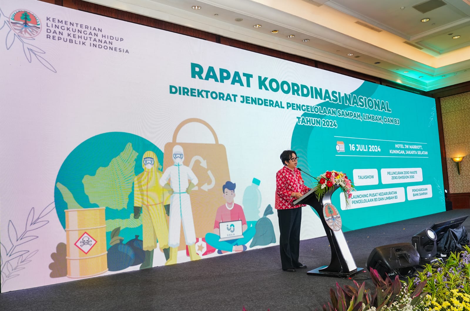 Menteri Lingkungan Hidup dan Kehutanan (LHK), Siti Nurbaya, membuka Rapat Koordinasi Nasional Pengelolaan Sampah, Limbah dan Bahan Berbahaya Beracun Tahun 2024 (Rakornas PSLB3 2024) yang diselenggarakan di Hotel JW Marriot, Jakarta pada Selasa (16 Juli 2024). Rakornas PSLB3 ini masih mengusung semangat Hari Lingkungan Hidup Sedunia 2024 dengan mengangkat tema “Zero Waste Zero Emission 2050”.
