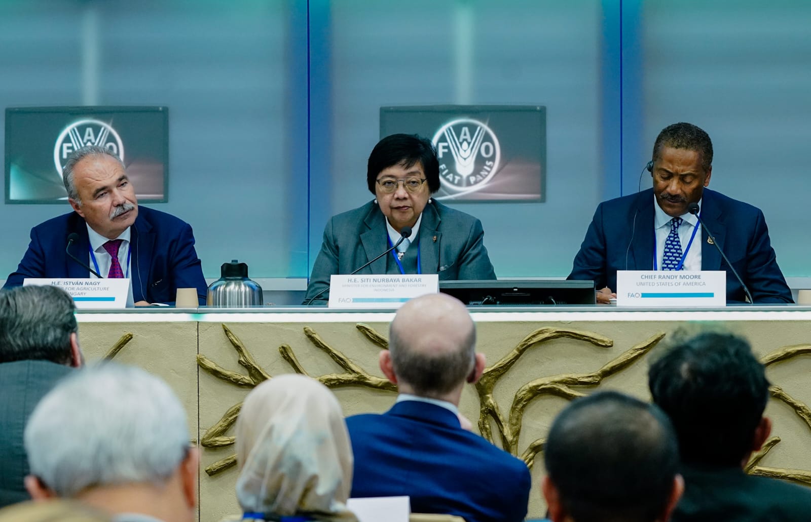 Menteri Lingkungan Hidup dan Kehutanan RI Siti Nurbaya menghadiri pertemuan Committee on Forestry (COFO) ke 27 di Roma, Italia. Pada Sesi Agenda Item 4 yang berjudul Keadaan Hutan Dunia 2024: Inovasi sektor kehutanan menuju masa depan yang lebih berkelanjutan, Menteri Siti memberikan apresiasi atas publikasi baru FAO 'Keadaan Hutan Dunia 2024' dengan tema utama 'Inovasi sektor kehutanan menuju masa depan yang lebih berkelanjutan'.