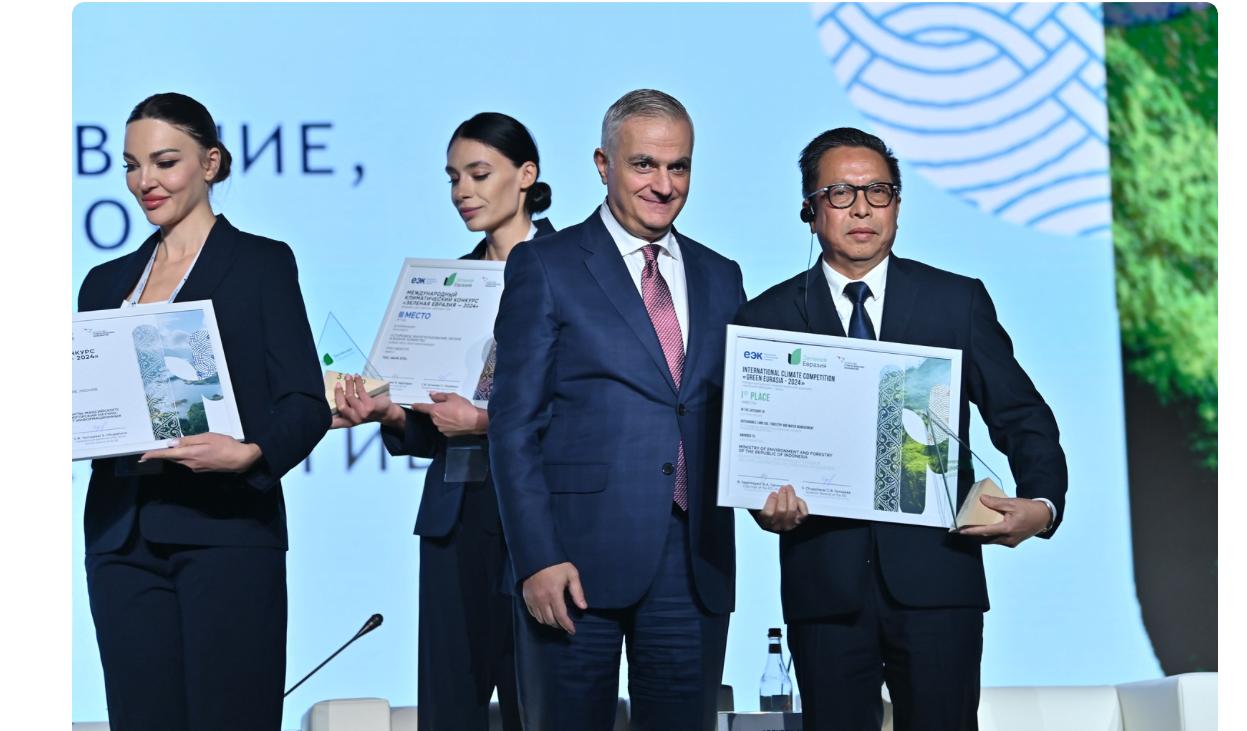 Kementerian Lingkungan Hidup dan Kehutanan (KLHK) menerima penghargaan Green Eurasia 2024 di Yerevan, Armenia pada Eurasian Economic Forum (EEF) 2024. Dalam Green Eurasia Award 2024, Eurasian Economic Commision (EEC) Board menetapkan KLHK sebagai Pemenang Peringkat Pertama (1st Place) dari International Climate Competition “Green Eurasia” 2024 untuk Kategori Sustainable Land Use, Forestry and Water Management. Green Eurasia Award 2024 diberikan atas inisiatif kebijakan dan komitmen Indonesia atas kebijakan Zero Burning Practices dalam penanganan emisi dari lahan dan hutan serta upaya pengendalian perubahan Iklim.