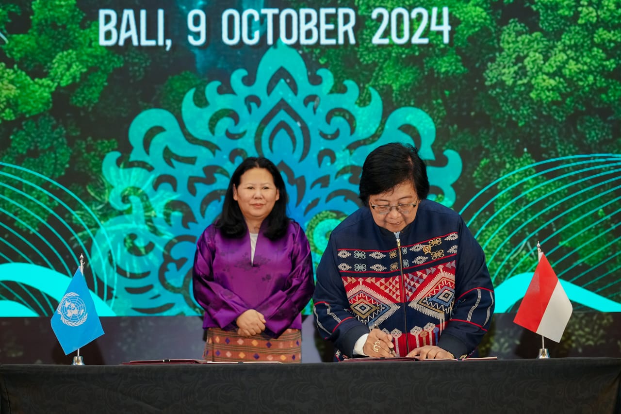 Kementerian Lingkungan Hidup dan Kehutanan Indonesia (KLHK) dan United Nation Environment Program (UNEP) menjalin Kerja Sama di Bidang Lingkungan Hidup dan Kehutanan. Penandatanganan Memorandum of Understanding (MoU) dilakukan oleh Menteri LHK Siti Nurbaya dan Direktur Kantor Regional UNEP untuk Asia dan Pasifik, Dechen Tsering di Bali, Rabu (9/10/2024).