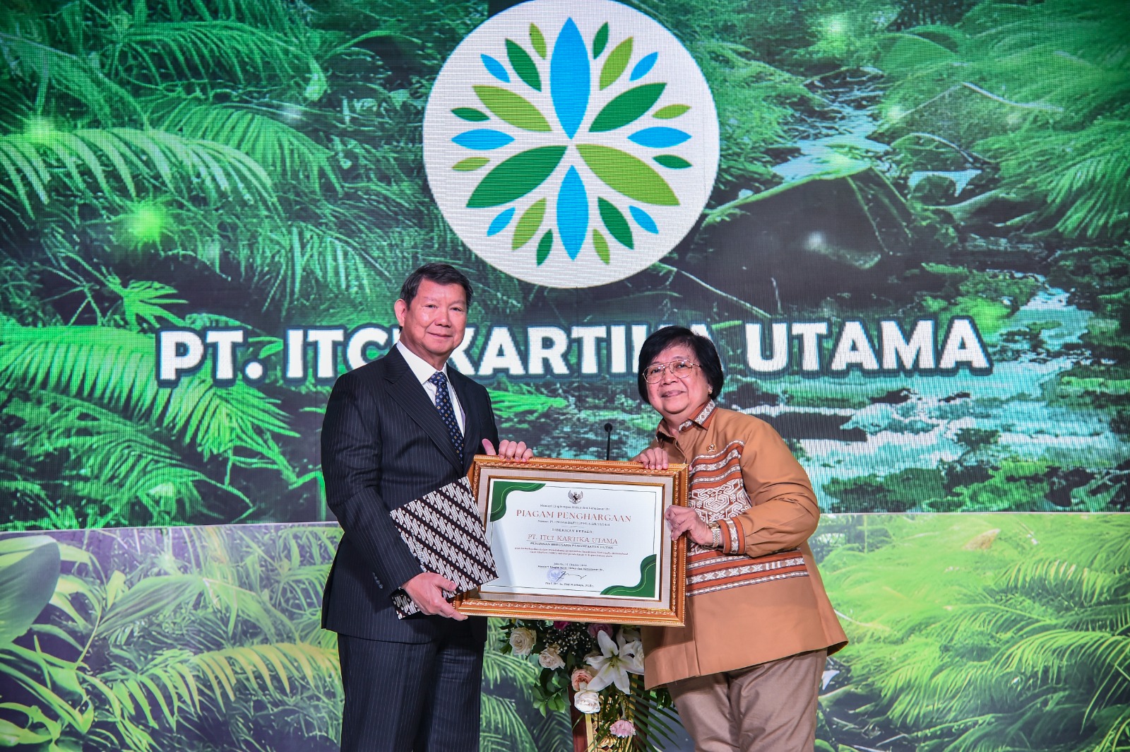 Menteri LHK Siti Nurbaya memberikan penghargaan kepada PT ITCI Kartika Utama (ITCIKU) sebagai pemegang perijinan berusaha pemanfaatan hutan (PBPH), atas keberhasilannya dalam mendukung pemenuhan kontribusi Nationally Determined Contribution (NDC) yang ditetapkan secara nasional melalui pendekatan tutupan hutan alam.