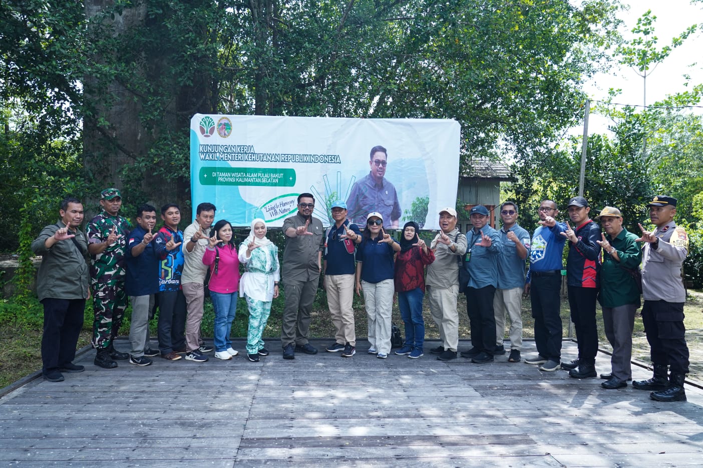 Wakil Menteri Kehutanan (Wamenhut) Sulaiman Umar melihat langsung pengelolaan kawasan Taman Wisata Alam (TWA) Pulau Bakut di tengah Sungai Barito, Kalimantan Selatan, pada Sabtu (25/01/2025).