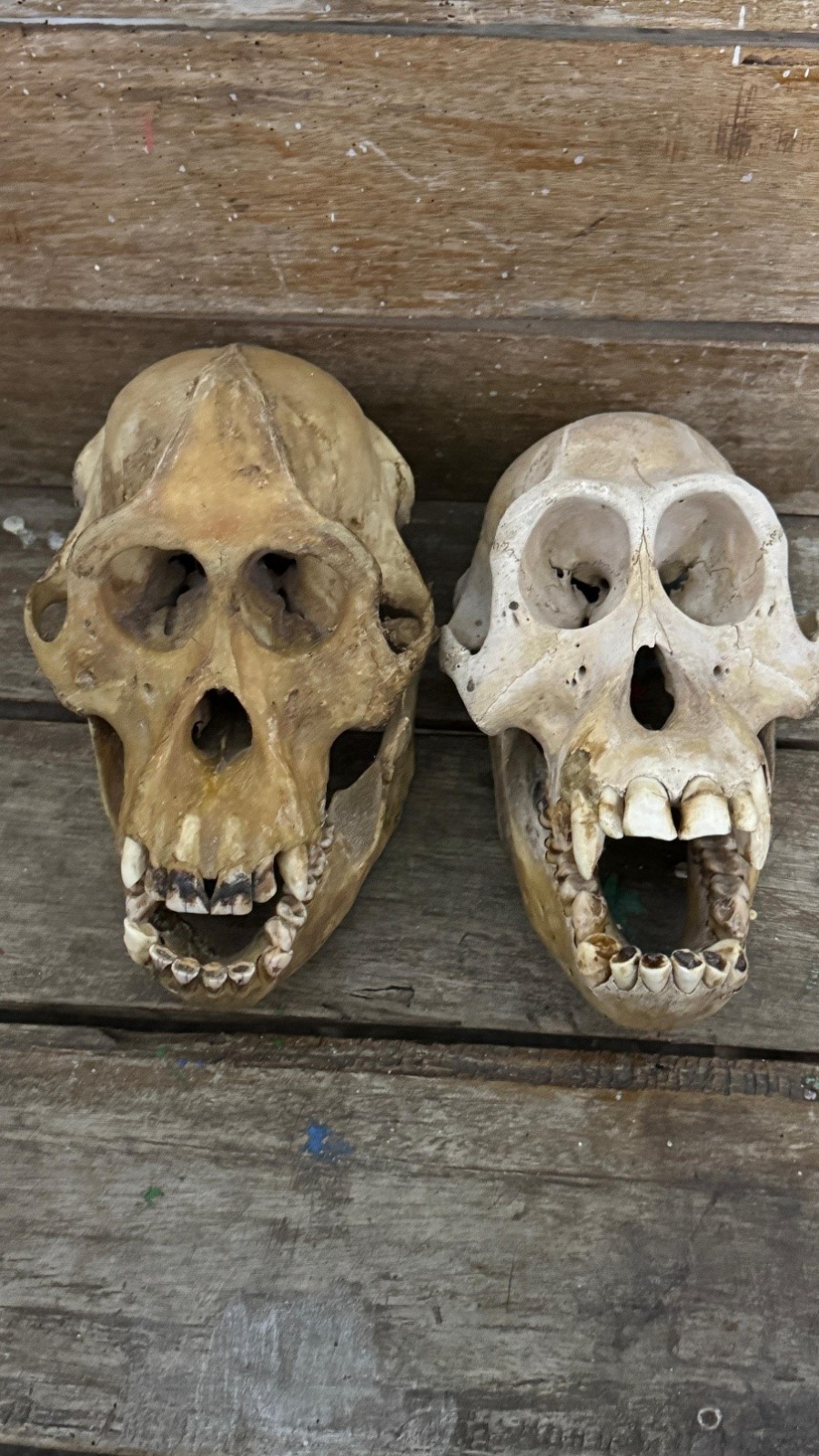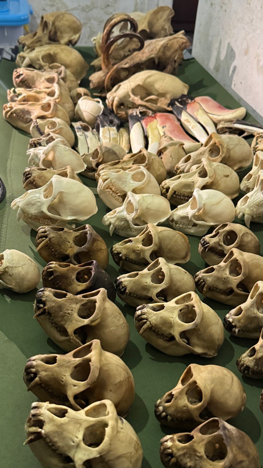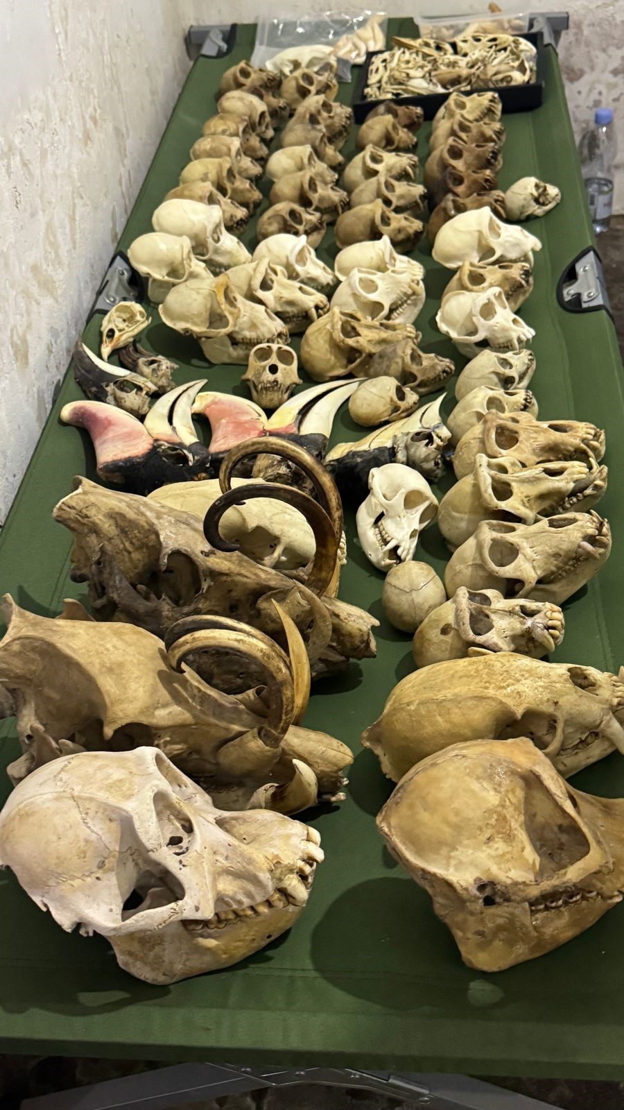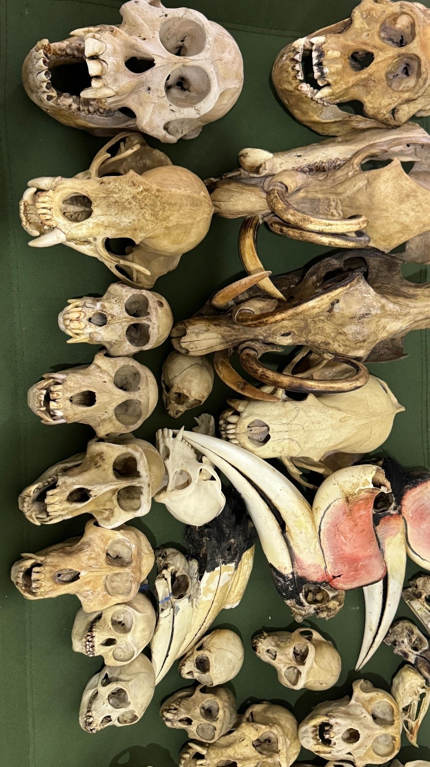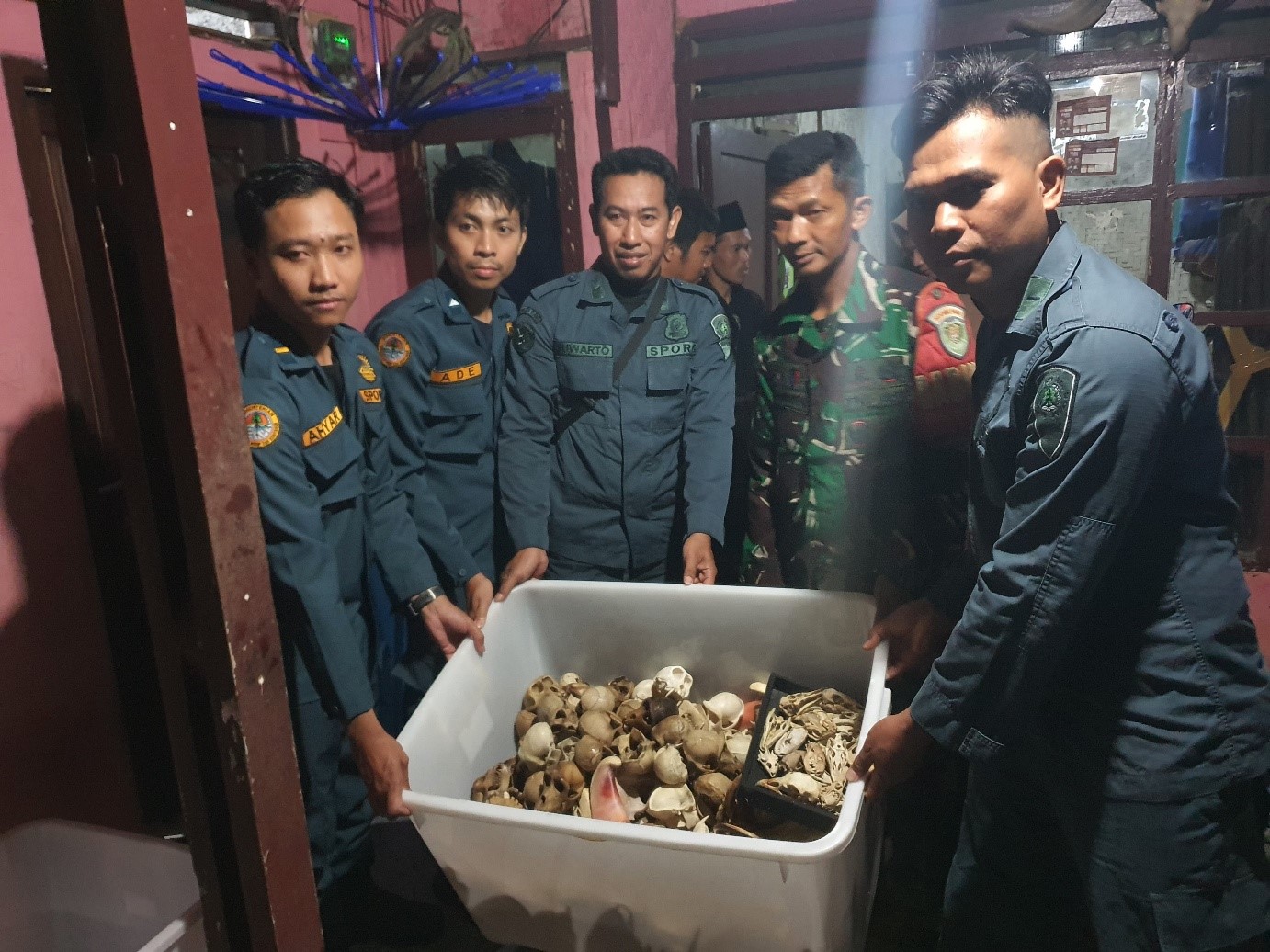 Dari pelaku berinisial BH (32 th), berperan sebagai pemilik dan NJ (23 th), berperan sebagai penjual ke luar negeri, diamankan bagian-bagian tubuh satwa liar dilindungi berupa 70 (tujuh puluh) buah tengkorak jenis primata (orangutan, beruk dan monyet), 6 (enam) buah paruh rangkong, 2 (dua) buah tengkorak beruang, 2 (dua) buah tengkorak babi rusa, 8 (delapan) buah kuku beruang, 2 (dua) buah gigi ikan hiu, dan 4 (empat) buah tengkorak musang.