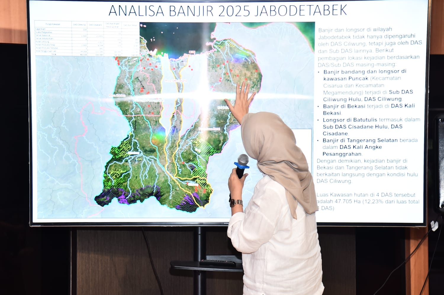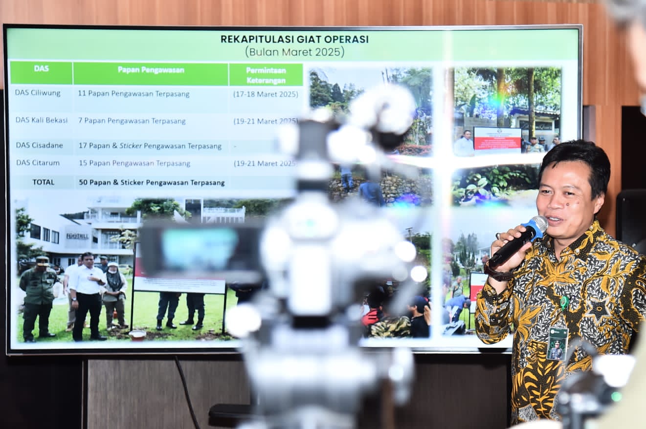 Pada media briefing di kantor Kementerian Kehutanan di Jakarta, Kamis (20/3), Direktur Jenderal Penegakan Hukum (Gakkum) Kehutanan – Januanto, menjelaskan secara analitik adanya temuan alih fungsi lahan di kawasan hutan yang tidak terkendali di hulu DAS Ciliwung, DAS Kali Bekasi, DAS Cisadane, dan lain-lain yang turut memicu kekritisan kawasan dalam fungsinya untuk pengendalian tata air.