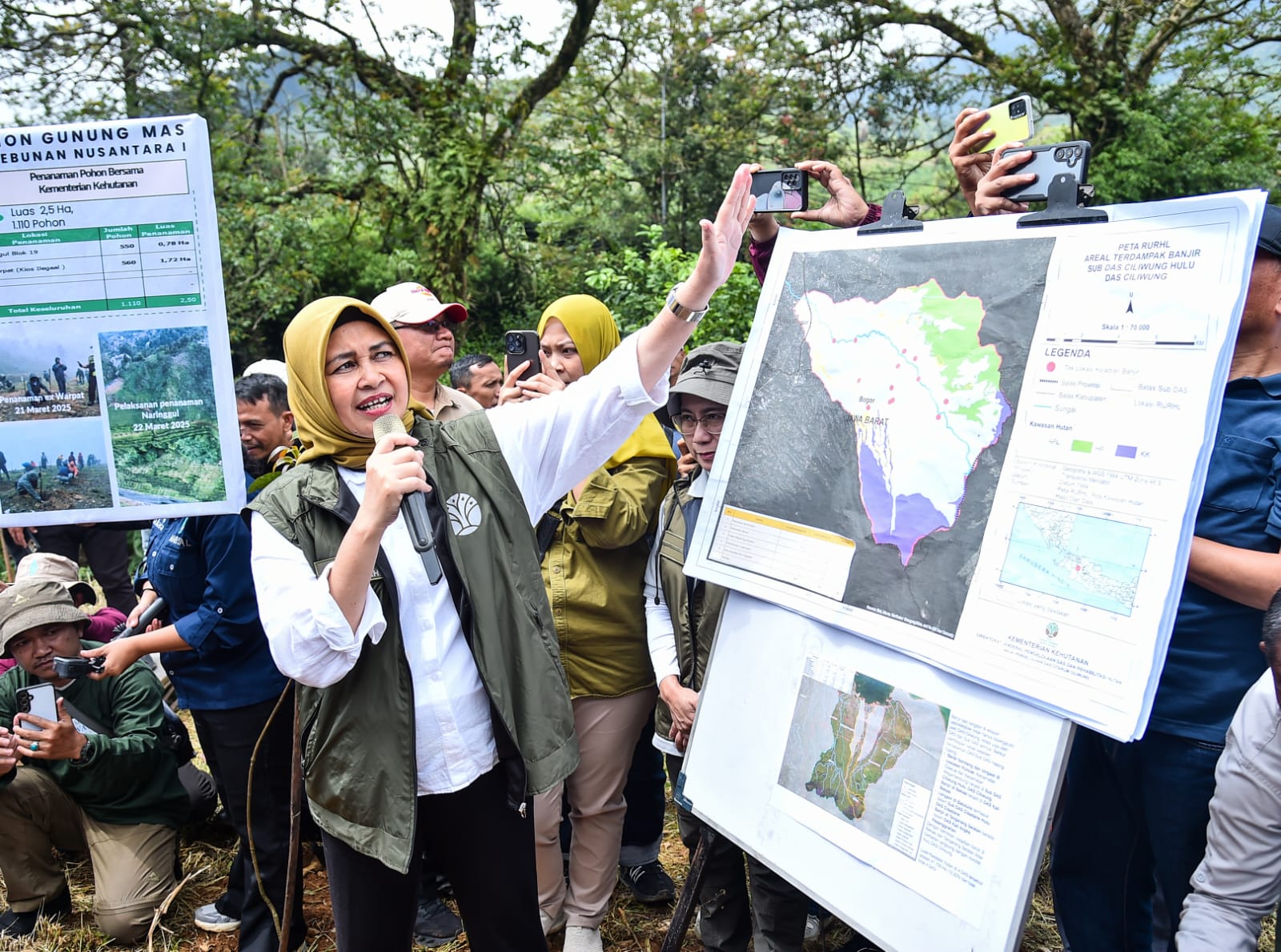 Kementerian Kehutanan bersama berbagai pihak menggelar kegiatan penanaman pohon di Naringgul dan PTPN Ex-Warpat Puncak Bogor, sebagai langkah strategis dalam menangani bencana hidrometeorologis dan mengurangi dampak perubahan iklim, pada Sabtu 22 Maret 2025.