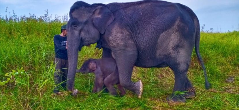 Seekor anak gajah jantan lahir dari induk bernama Sabana di Pusat Latihan Gajah (PLG) Jalur 21 Suaka Margasatwa Padang Sugihan, Balai Ko...