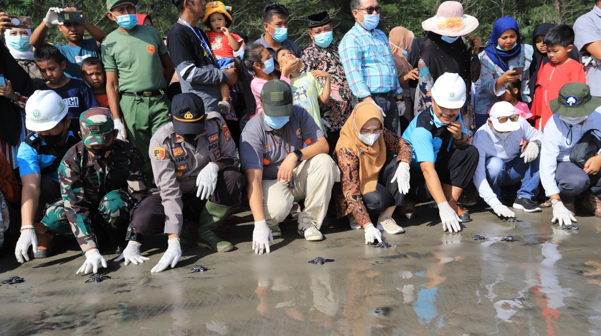 Sebanyak 145 ekor tukik yang terdiri dari 29 ekor Penyu Belimbing (Dermochelys coriacea) dan 116 ekor Penyu Lekang (Lepidochelys olivacea) dilepasl...