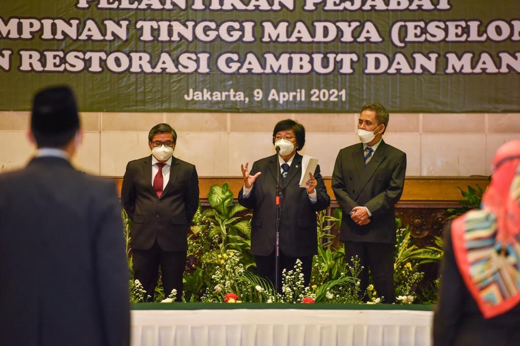 Menteri LHK Siti Nurbaya melantik dua Pejabat Tinggi Madya (Eselon I) lingkup Kementerian LHK di Auditorium Dr. Soedjarwo Manggala Wanabakti Jakarta, ...