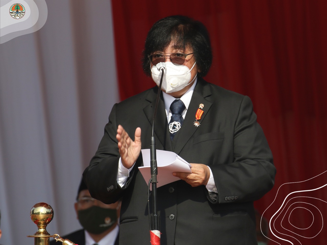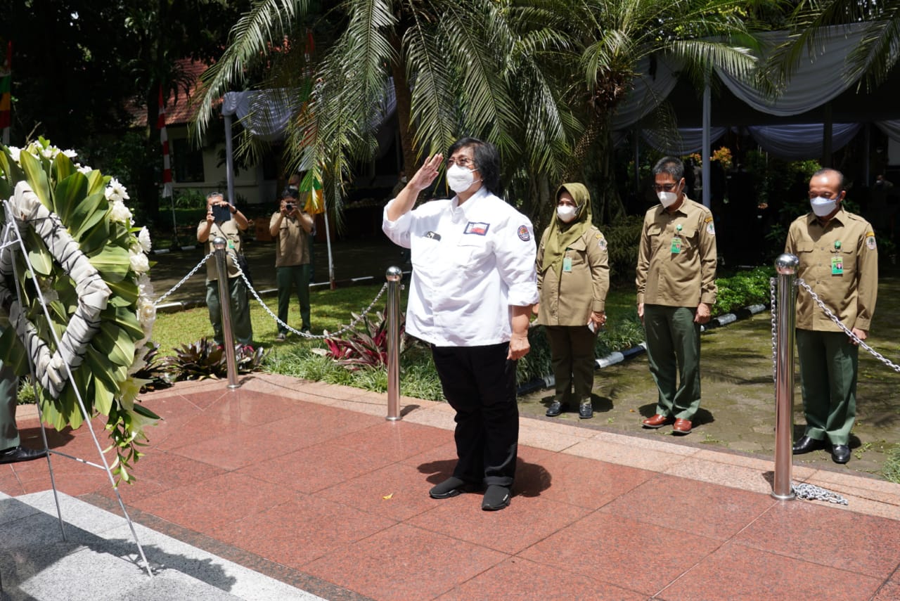 Menteri Lingkungan Hidup dan Kehutanan (LHK) Siti Nurbaya menjadi inspektur upacara Peringatan Hari Bakti Rimbawan, di Plasa Sujono Suryo Manggala ...