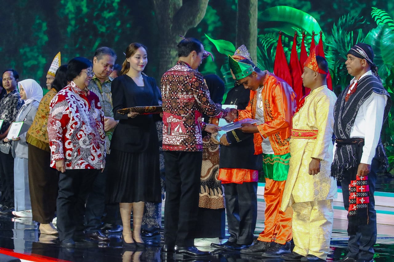 Presiden Joko Widodo menyerahkan Surat Keputusan (SK) Perhutanan Sosial dan SK Tanah Obyek Reforma Agraria (TORA), serta Sertifikat Layanan Dana Lingkungan kepada perwakilan masyarakat di Festival Lin...