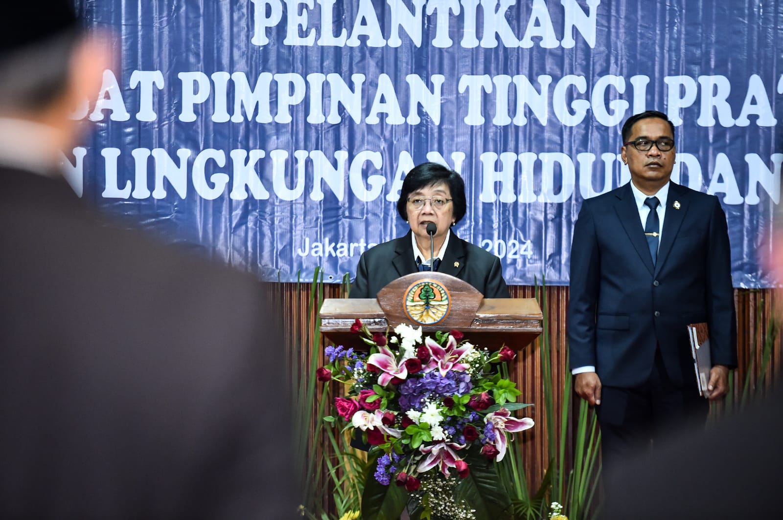 Menteri Lingkungan Hidup dan Kehutanan (LHK) Siti Nurbaya melantik enam Pejabat Tinggi Pratama (Eselon II) lingkup KLHK di Jakarta, Jumat (21/0...