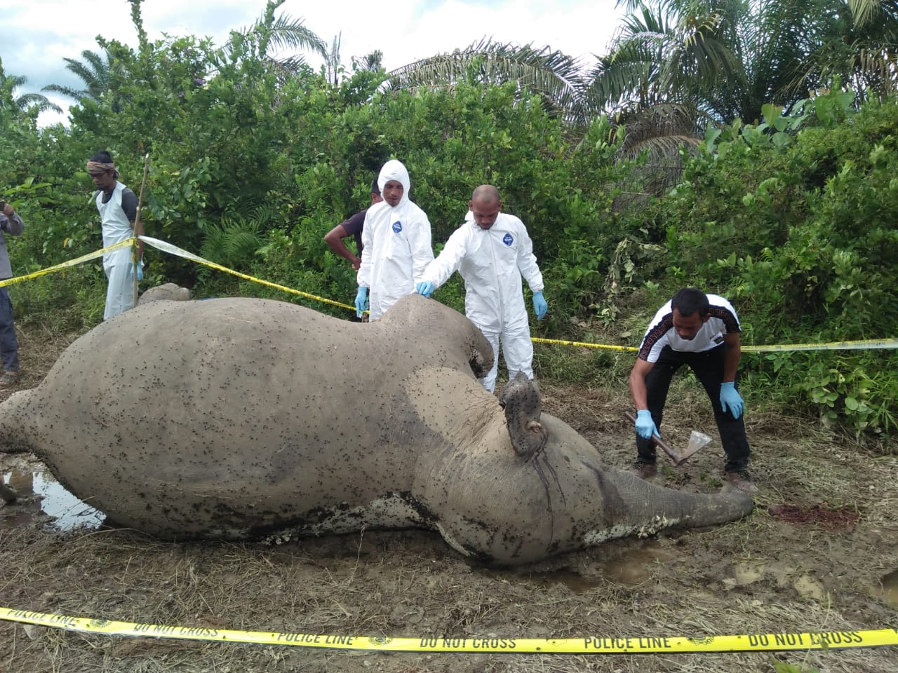 Tim BKSDA Aceh segera melakukan olah TKP dan nekropsi terhadap temuan bangkai Gajah Sumatera (Elephas maximus sumatranus) di wilayah Desa Srimu...