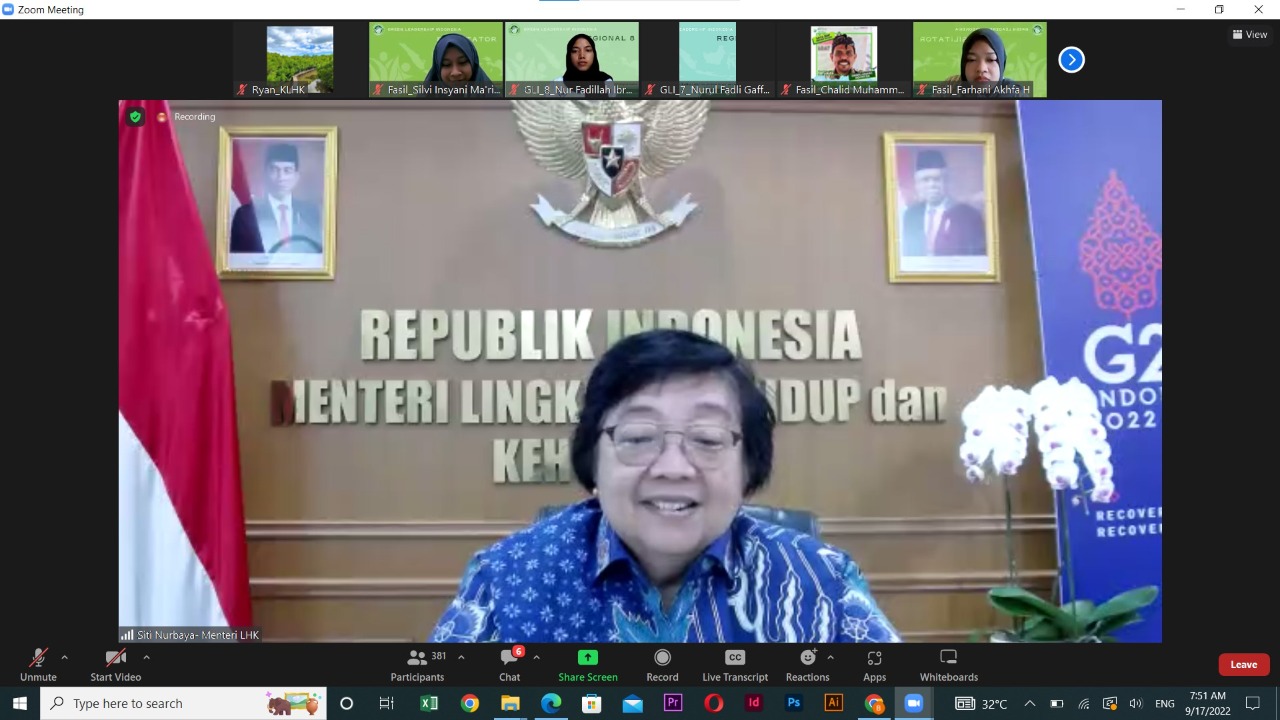 Menteri Lingkungan Hidup dan Kehutanan (LHK), Prof. Siti Nurbaya meresmikan Pelatihan dan Pendidikan kepada 350 pemuda dari berbagai regional dalam t...