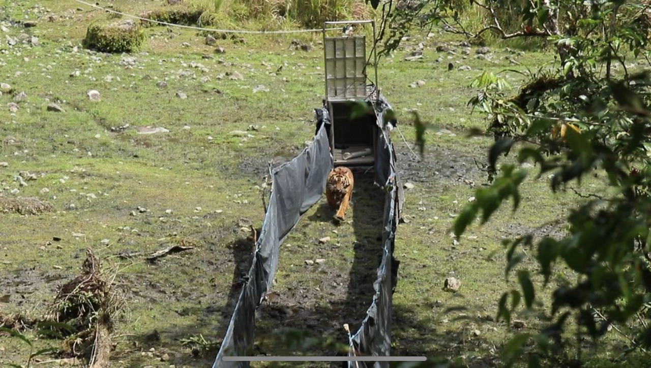Seekor harimau sumatera (Panthera tigris sumatrae) dilepasliarkan di areal Taman Nasional Kerinci Seblat (TNKS) Kabupaten Merangin, Provinsi Jambi ...