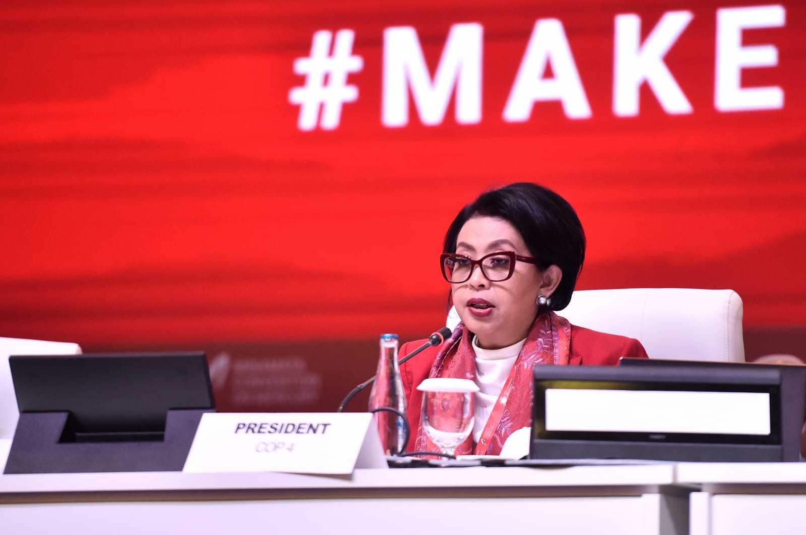 Direktur Jenderal Pengelolaan Sampah, Limbah dan B3 KLHK, Rosa Vivien Ratnawati yang juga selaku Presiden COP-4 Konvensi Minamat...