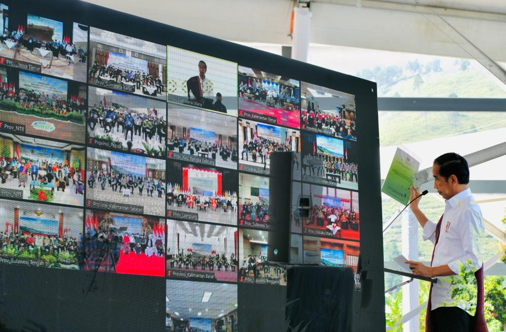 Menteri LHK Siti Nurbaya dan Wakil Menteri LHK Alue Dohong mendampingi Presiden Joko Widodo menyerahkan Surat Keputusan (SK) Hutan Sosial dan S...