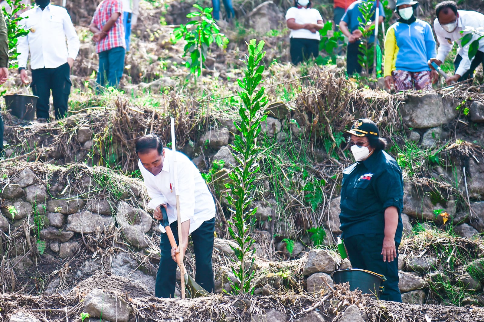 Menteri LHK Siti Nurbaya dan Wakil Menteri LHK Alue Dohong mendampingi Presiden Joko Widodo melakukan penanaman pohon di Desa Simangulampe Kecama...