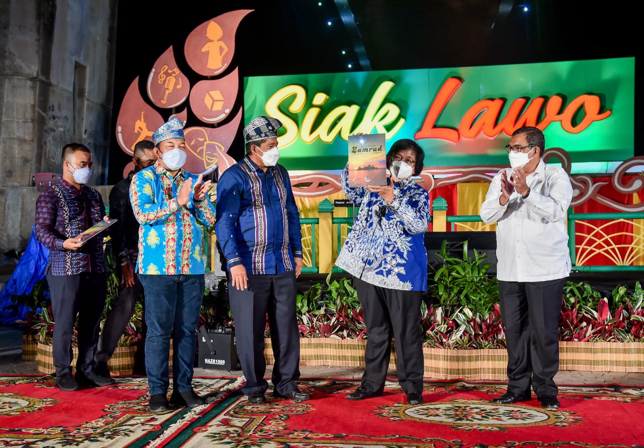 Menteri Lingkungan Hidup dan Kehutanan, Siti Nurbaya Bakar, menghadiri puncak acara Forest Art di Kota Siak, Provinsi Riau, Rabu (22/12/2021) malam. F...